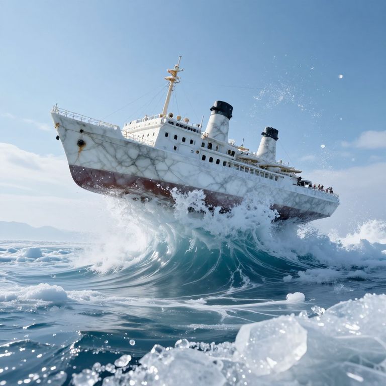An ocean frozen mid-wave, caught in perpetual collapse, with ships suspended like marble sculptures in crystalline motion.