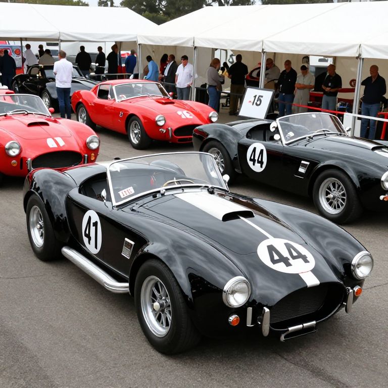 Classic race cars, including a sleek black Cobra with \"41\" and \"44\" decals, are prominently displayed at the 2006 Monterey Historic Races, surrounded by vibrant red and black vintage vehicles and attended by spectators under white tents.
