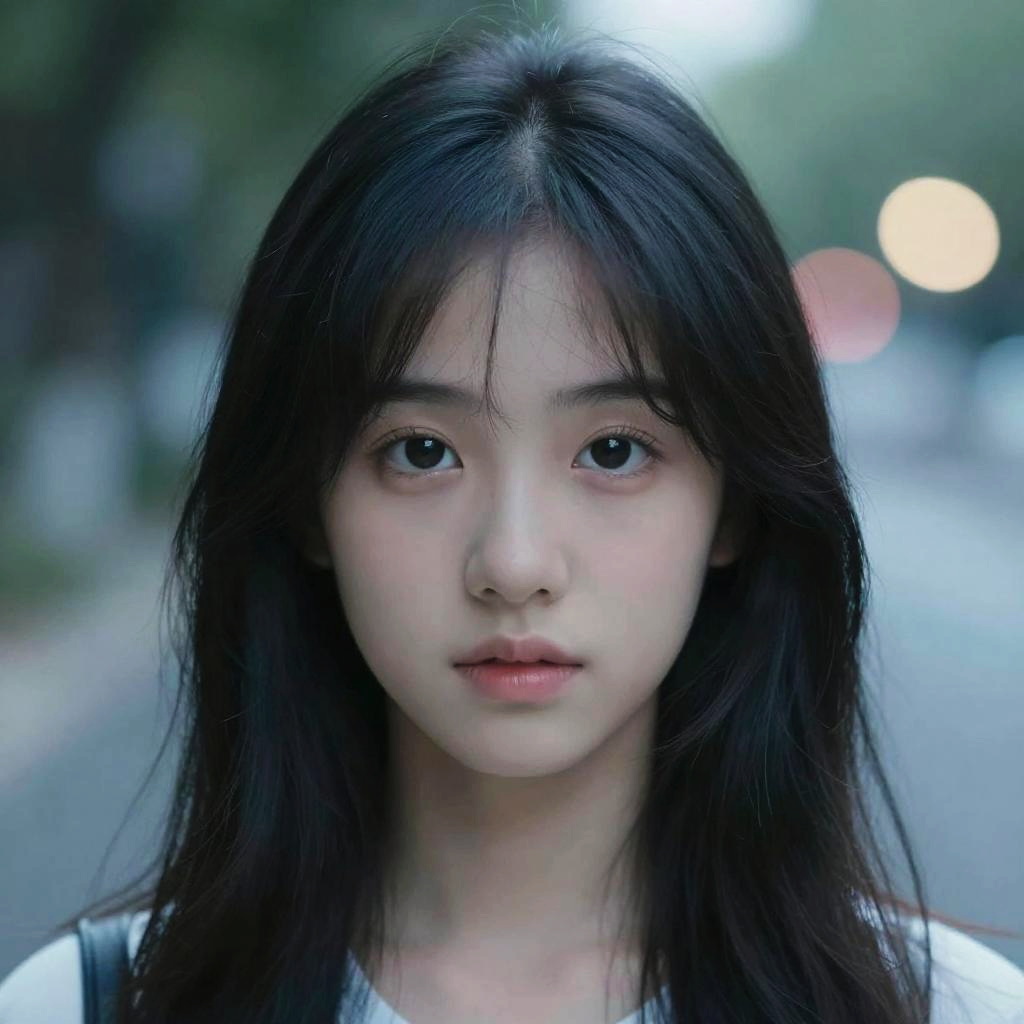 Close-up portrait of a girl with pretty black hair cascading down her shoulders, highlighted with subtle blue tint, soft skin tones, dreamy atmosphere with bokeh lights behind