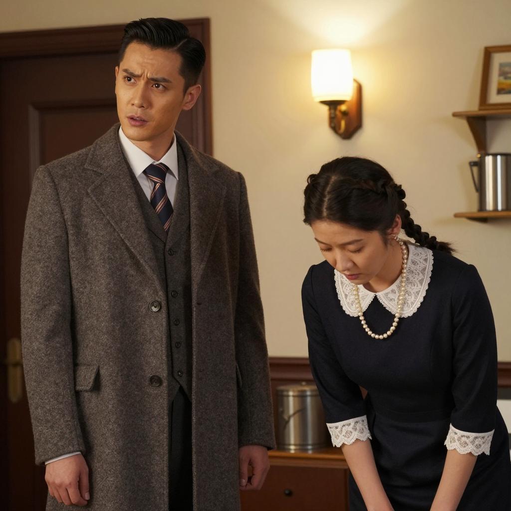 Two people facing each other indoors. Woman on left, dark hair, black turtleneck, white bow, intense gaze. Man on right, dark hair, mustache, dark suit, serious expression. Background: large window with sheer curtains, dim lighting. Both heads slightly tilted downward.