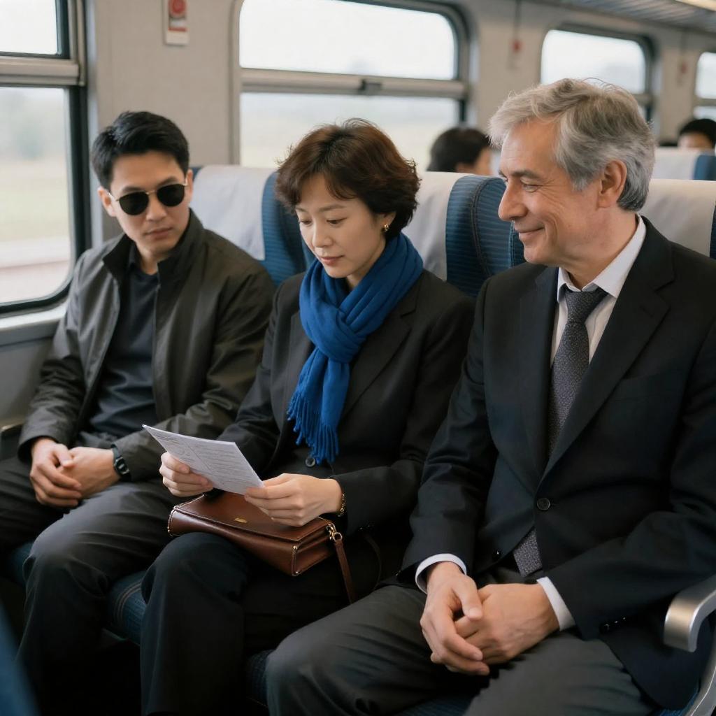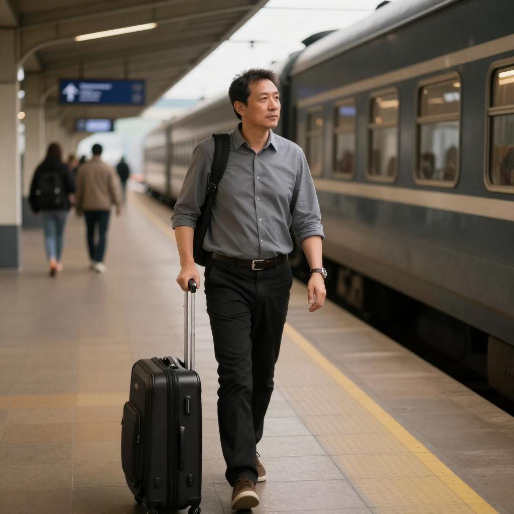 Photograph of a middle-aged man with short dark hair, wearing a gray shirt and black pants, standing on a yellow-tiled train platform. He holds a black rolling suitcase in his right hand and looks to the left. A dark gray train with large windows is on the right. Other passengers are in the background.