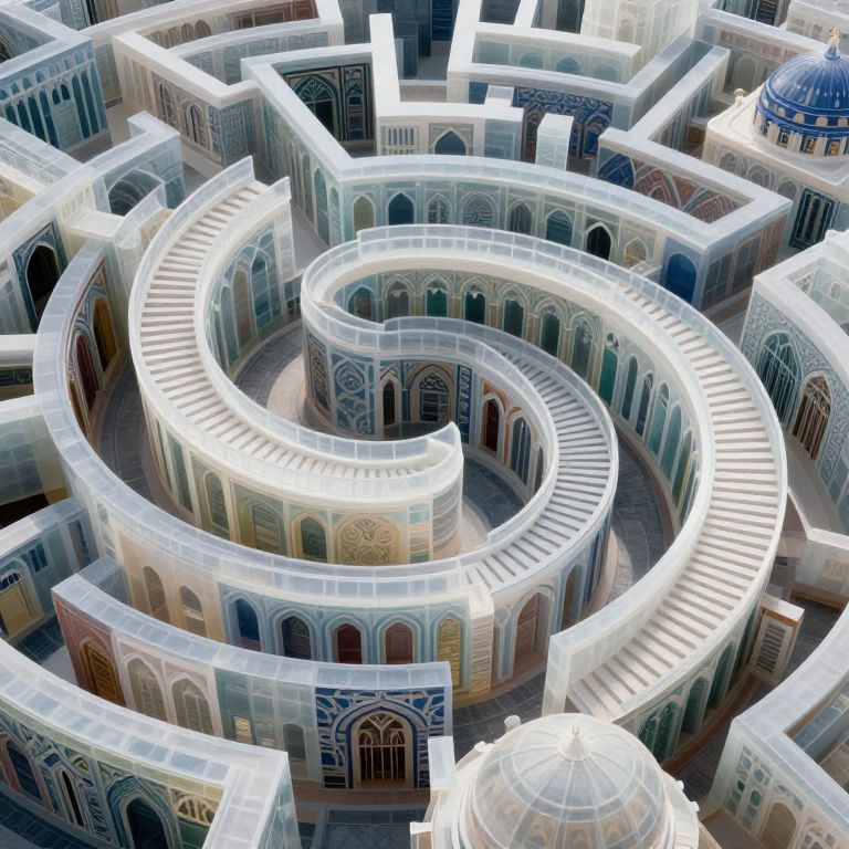 A surreal aerial view of an intricate spiral maze composed of translucent and semi-transparent geometric structures. The maze features ascending and descending staircases with architectural elements such as Gothic arches, Byzantine domes, and Art Nouveau patterns, creating a visually mesmerizing labyrinth that defies conventional spatial logic.