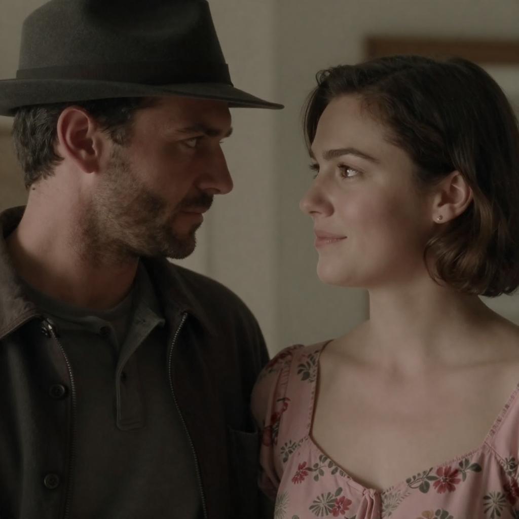 Photograph of a man and woman standing outdoors near a chain-link fence. The man, in a brown suit, white shirt, and patterned tie, wears a brown fedora. The woman, with short blonde hair, wears a white polka-dot dress. They look at each other, with the man slightly leaning towards the woman. The background includes a blurred urban setting.