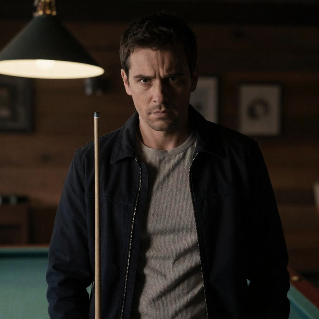 Photograph of a man standing in a dimly lit hallway. He has short brown hair, pale skin, and wears a navy blue sweater with brown pants. He looks serious with a slight frown. Brown curtains frame the right side, and a glowing light fixture is in the background.
