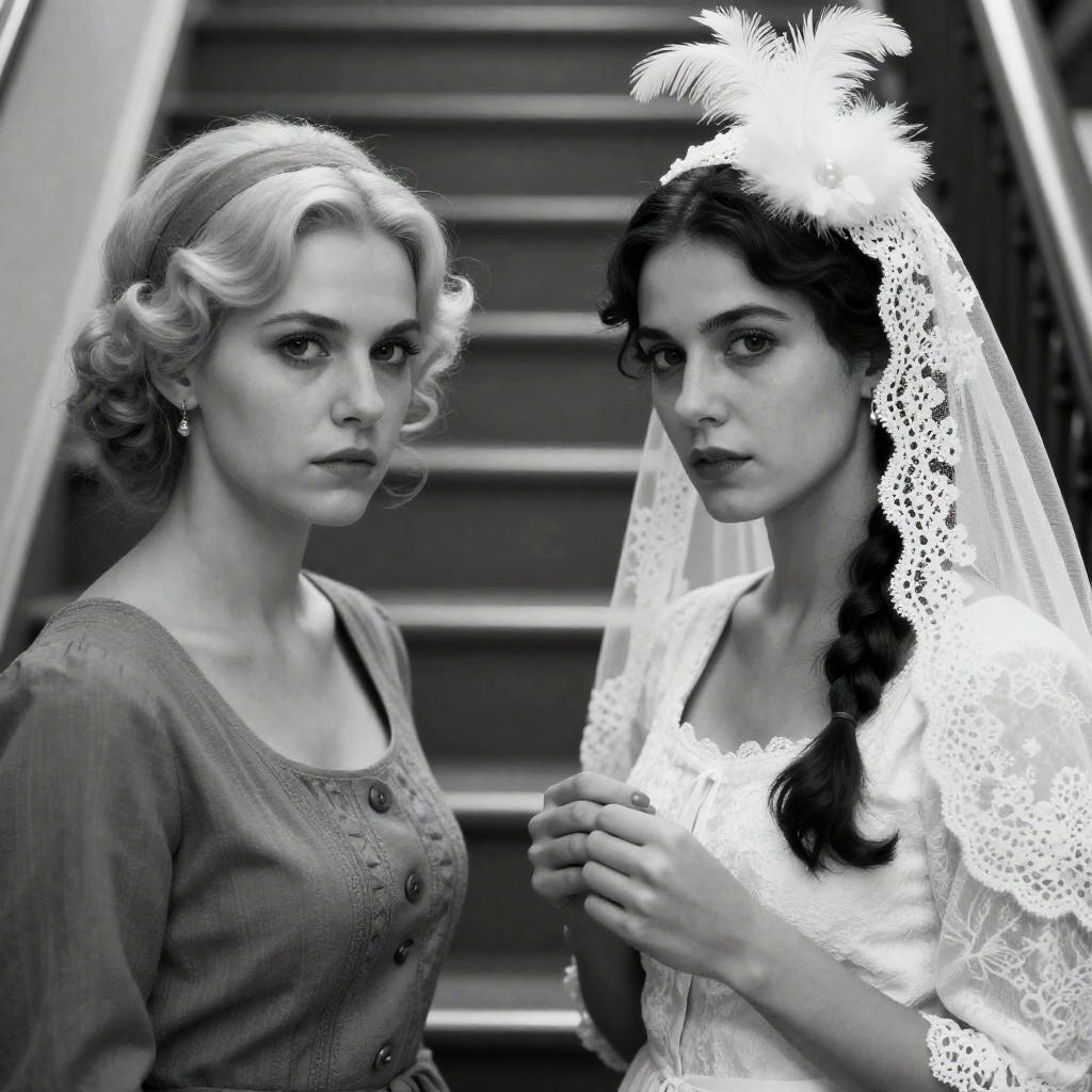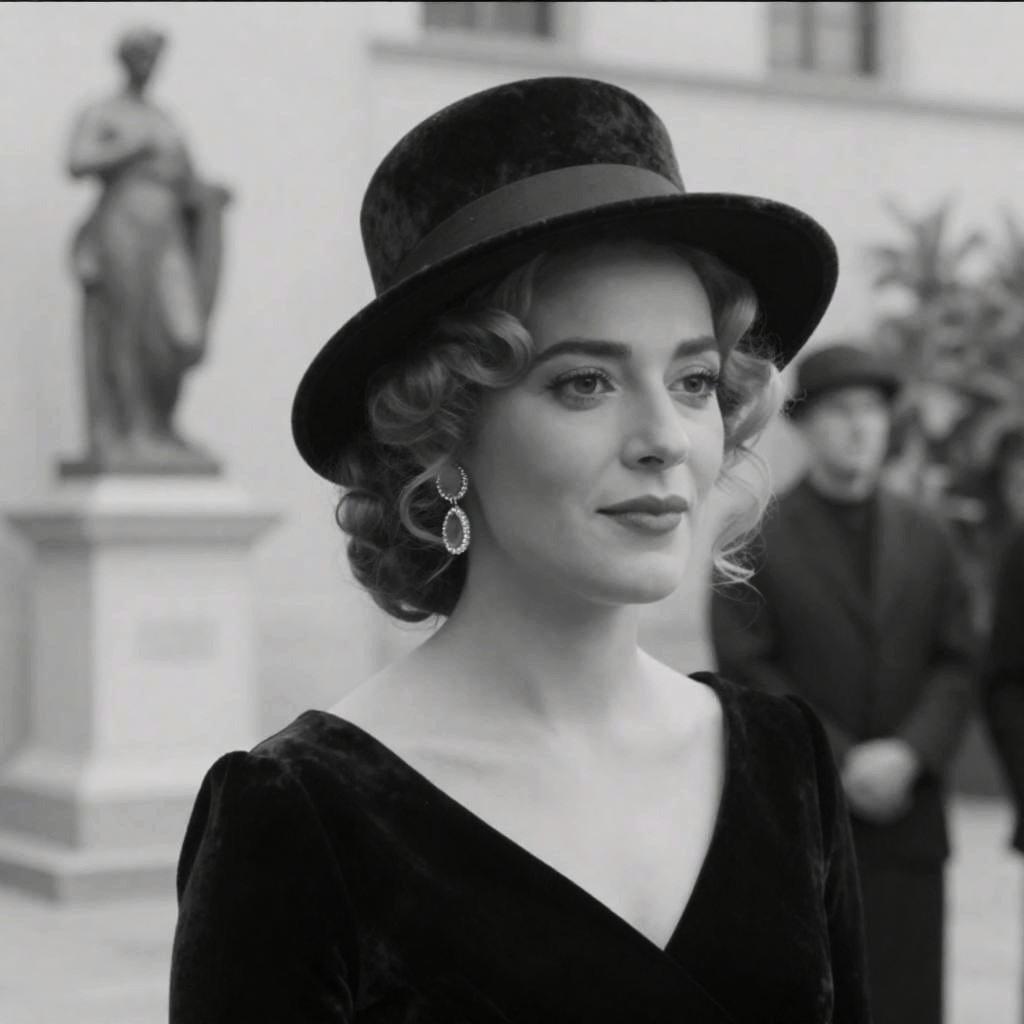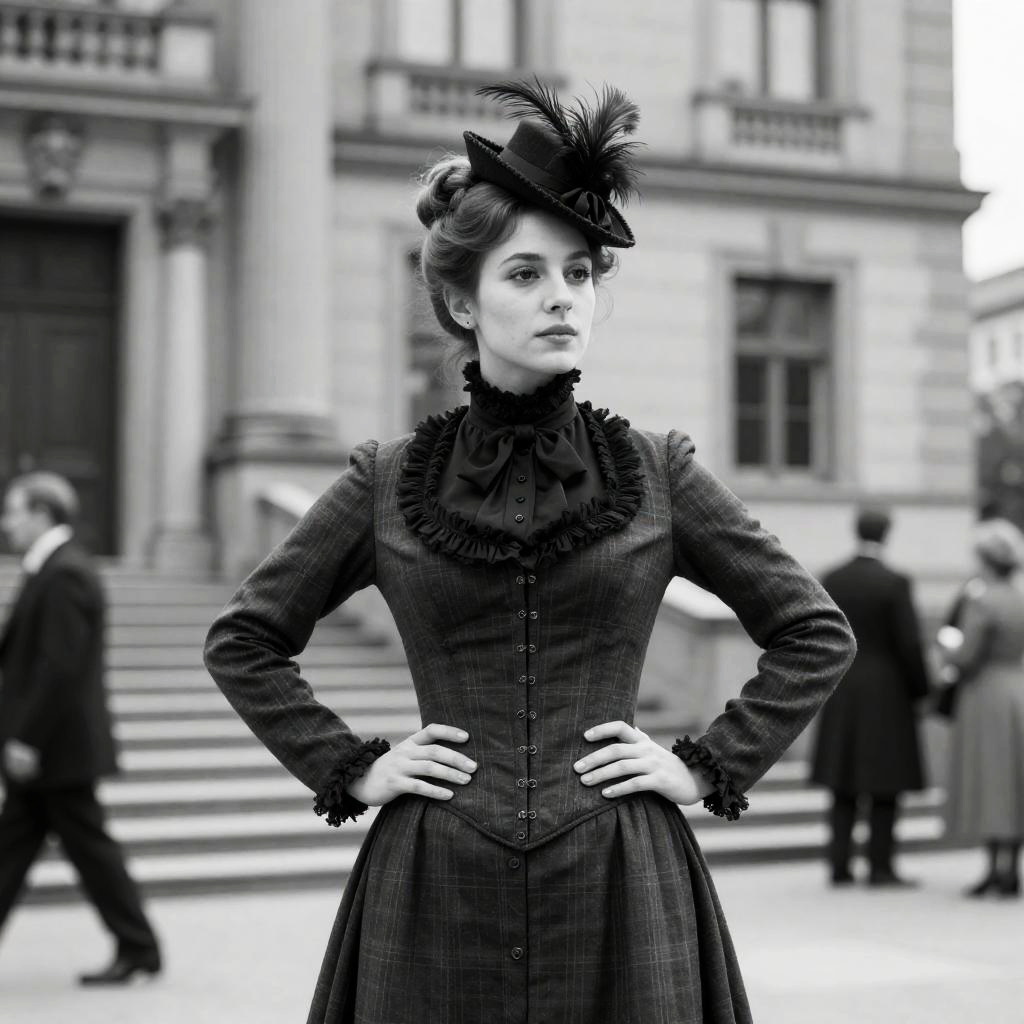 Black-and-white photograph of a woman in Victorian-style dress with a corset, high collar, and plaid sleeves. She has an updo with a small hat adorned with a feather. Hands on hips, confident expression. Background includes a tall, ornate building with windows and steps. Several people in the background are blurred.