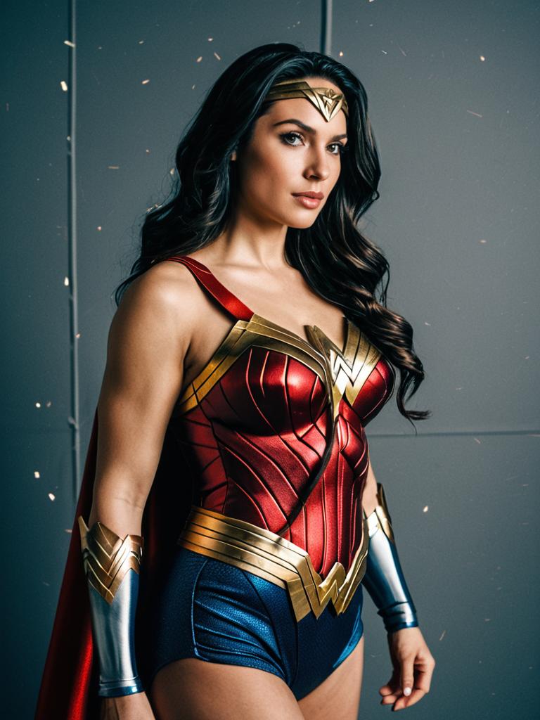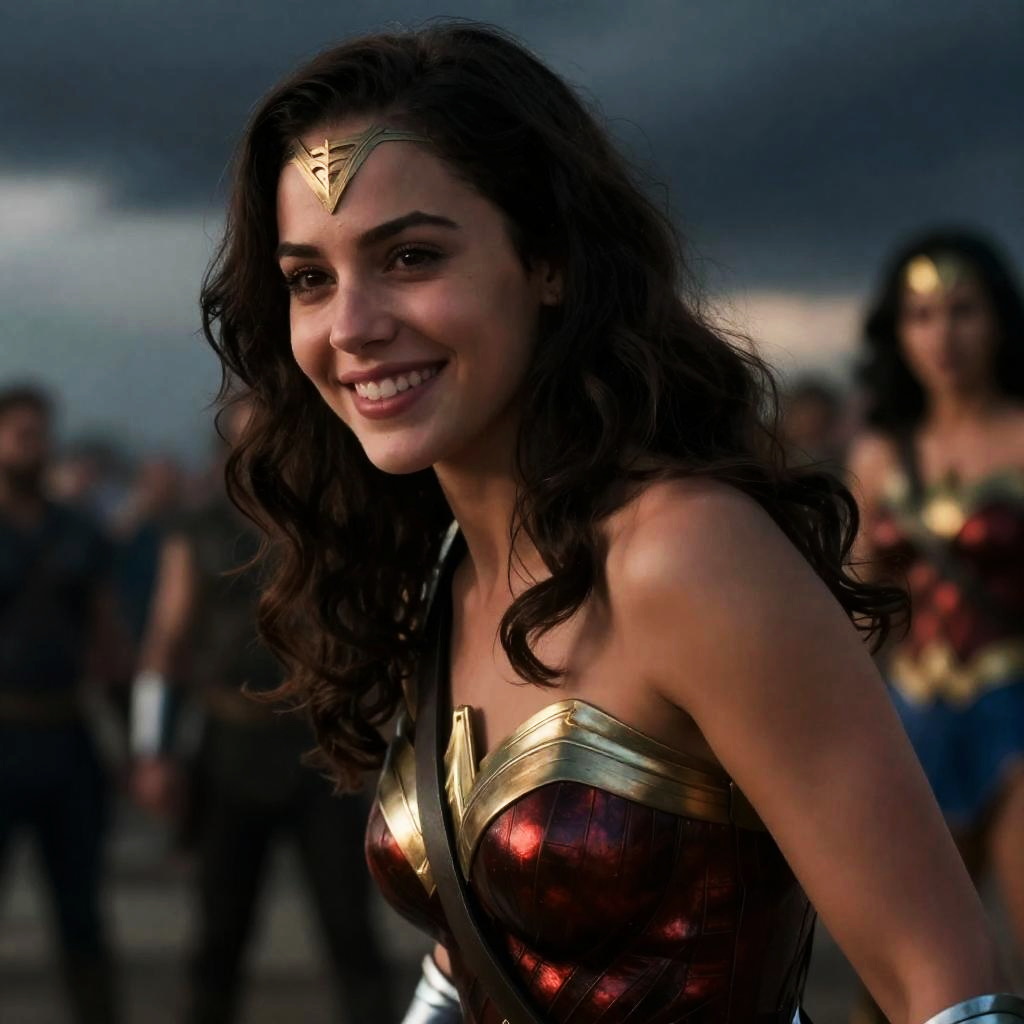 Photograph of a smiling woman with long, wavy dark hair, wearing a red and gold Wonder Woman costume, standing outdoors against a cloudy sky,