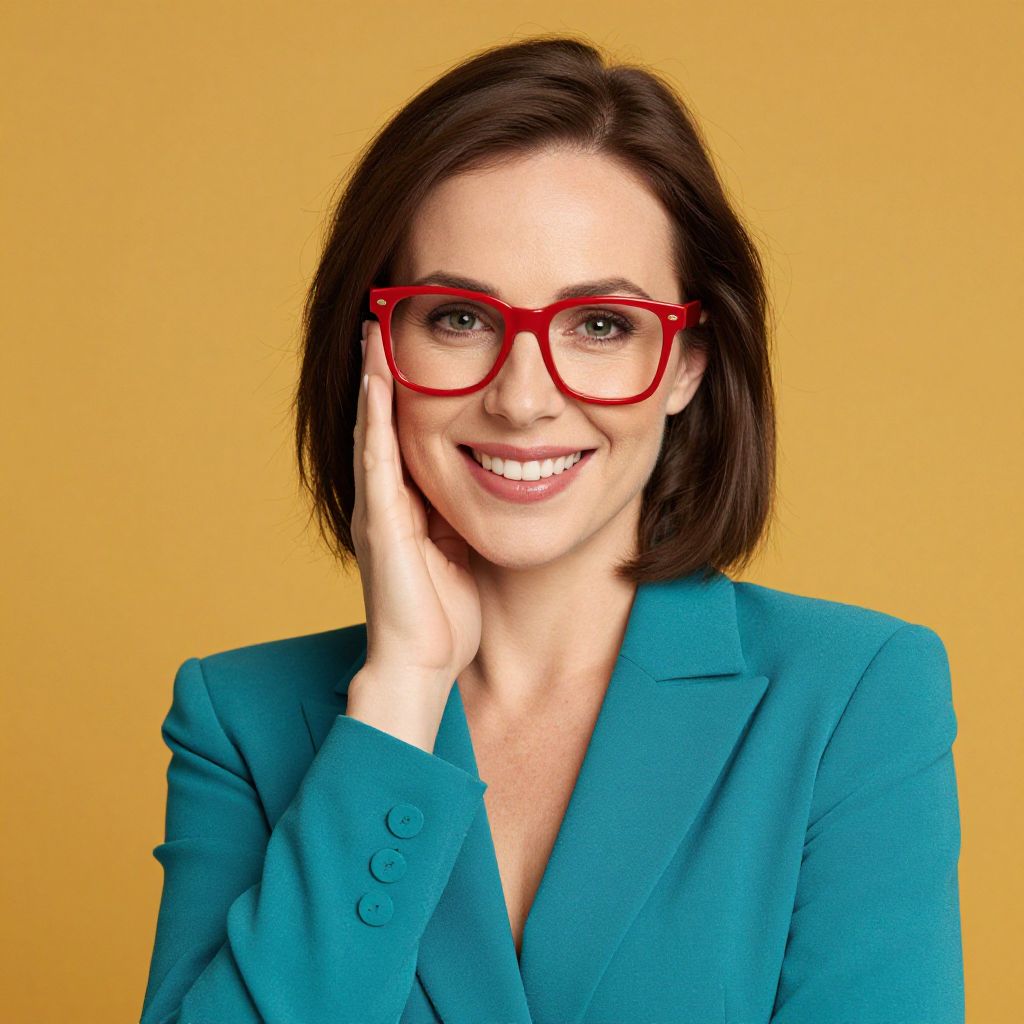 Confidently poised woman wearing vibrant red glasses and a teal blazer, her hand thoughtfully resting against her cheek as she smiles warmly against a golden-yellow background.