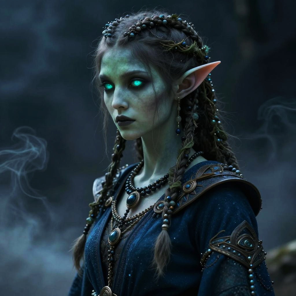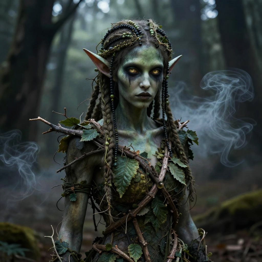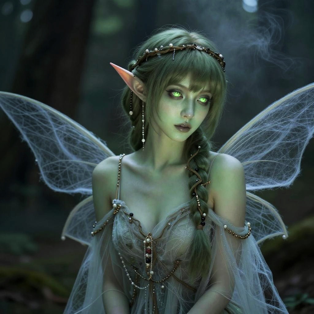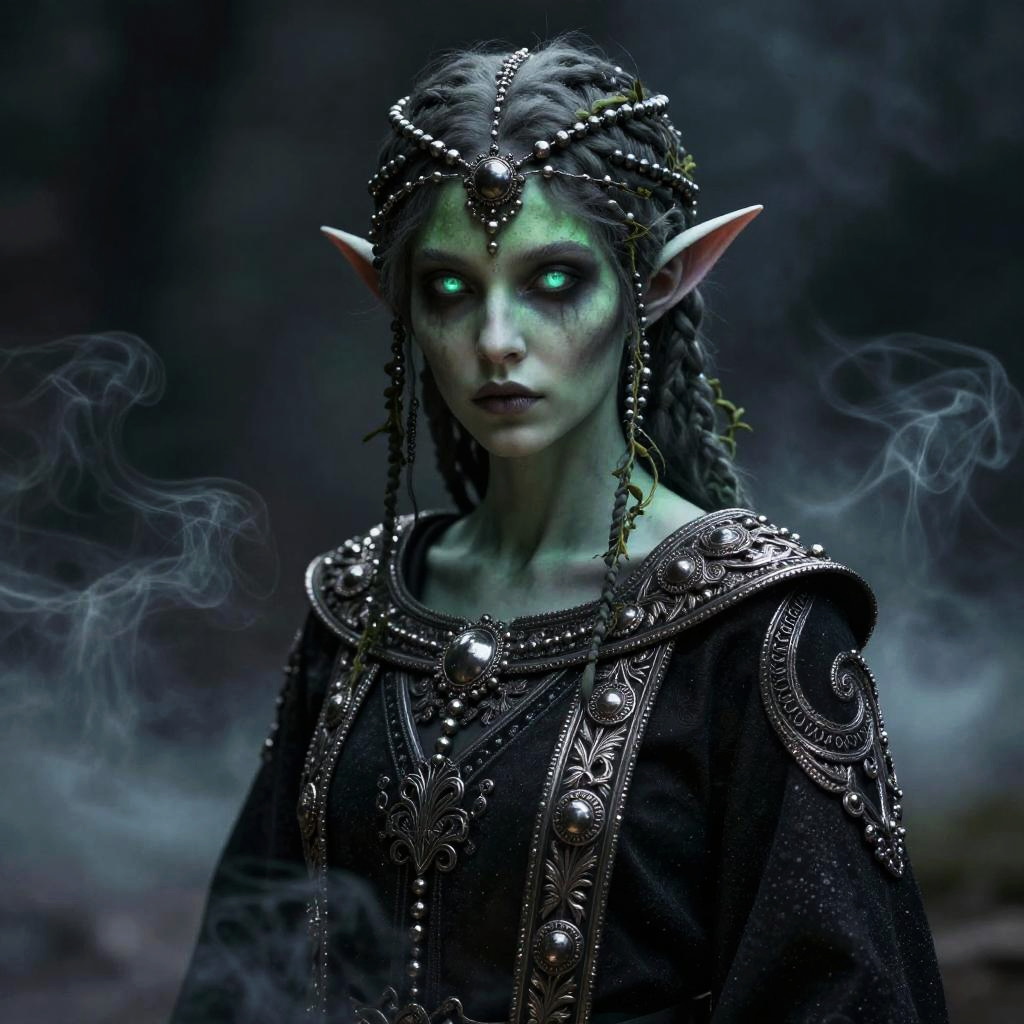 Lithe woodland nymph, with short hair braided with beads and vines, elongated pointed ears, glowing eyes, pale green skin, surrounded by dark ethereal smoke, wearing delicate spider silk gown, detailed and atmospheric