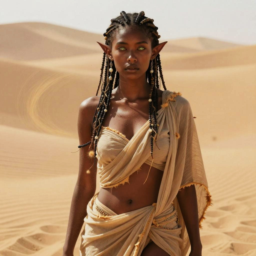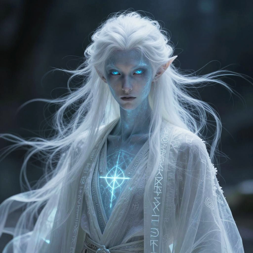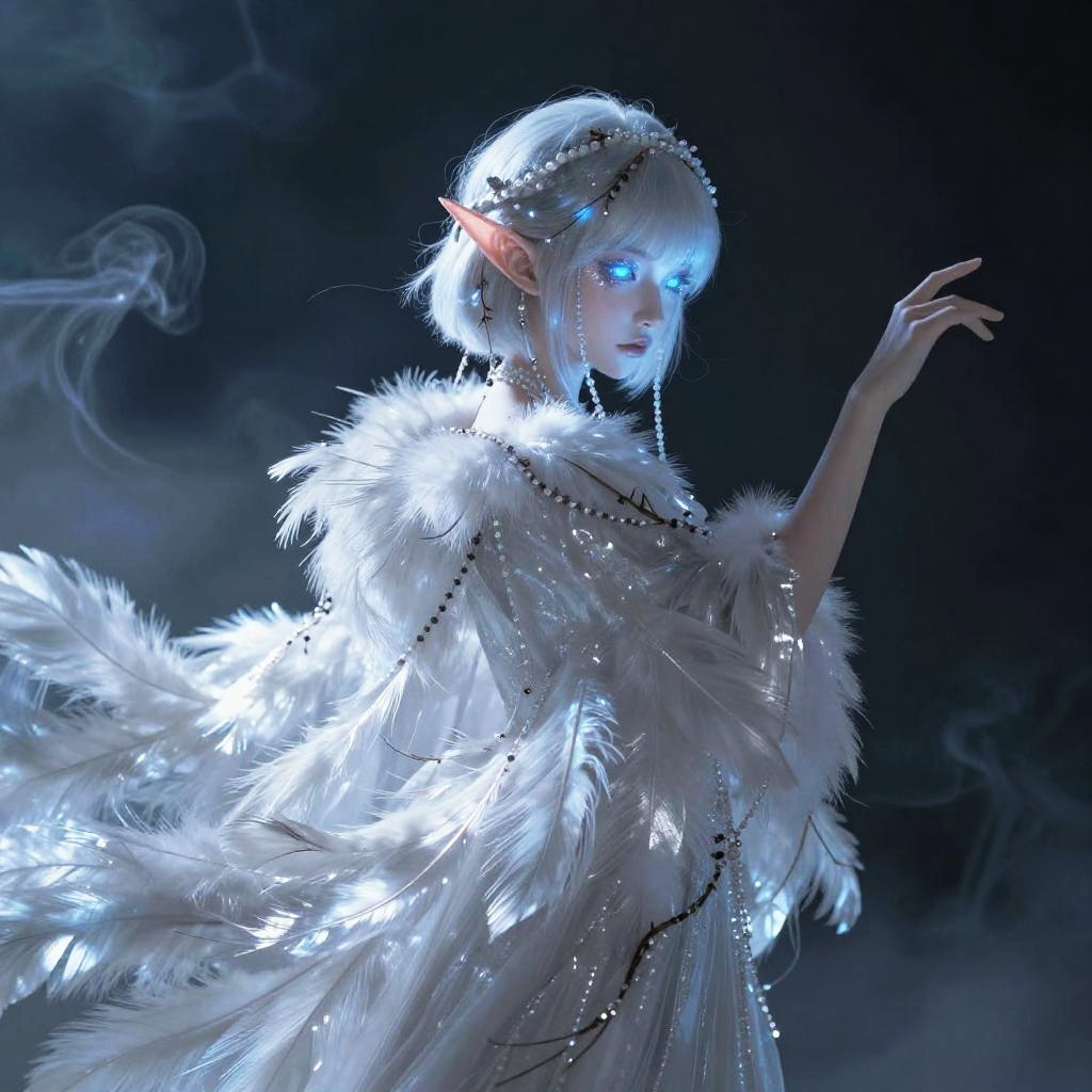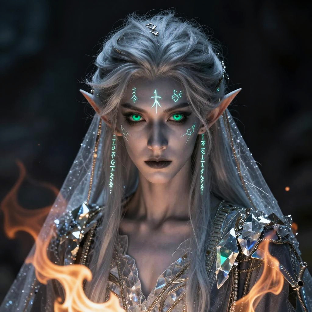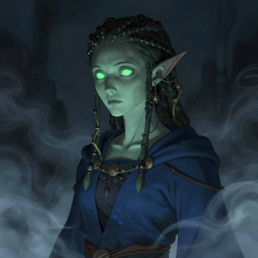 Lithe woodland nymph, with short hair braided with beads and vines, elongated pointed ears, glowing eyes, pale green skin, surrounded by dark ethereal smoke, wearing delicate spider silk gown, detailed and atmospheric