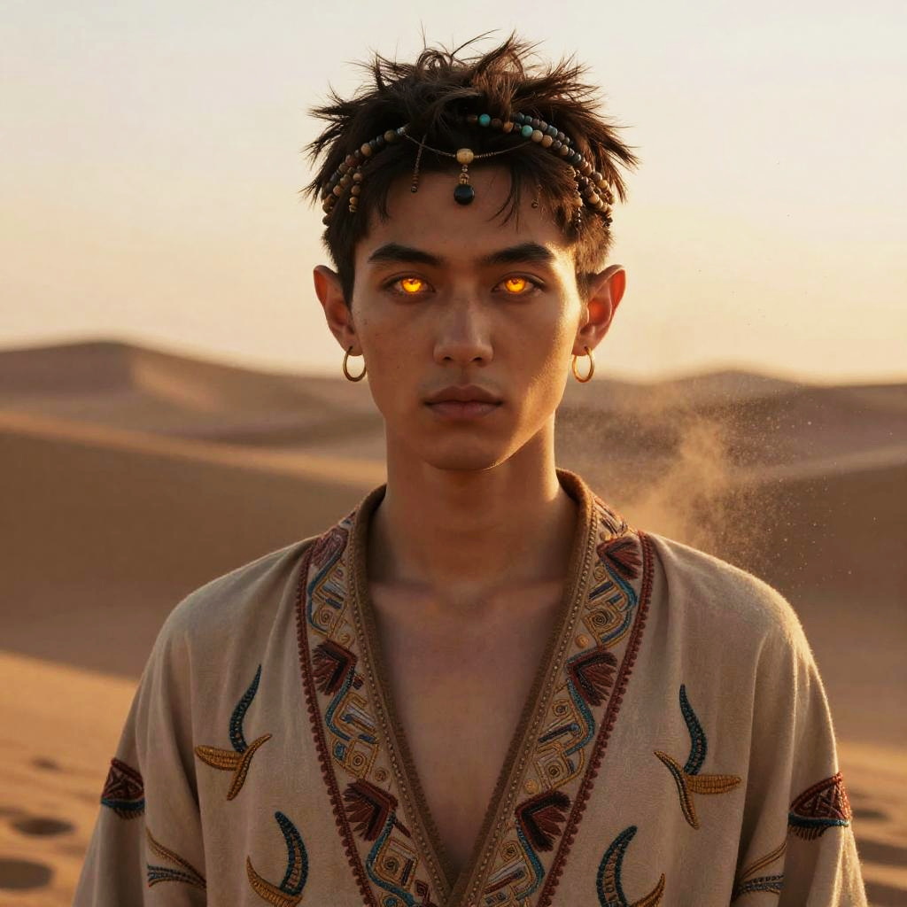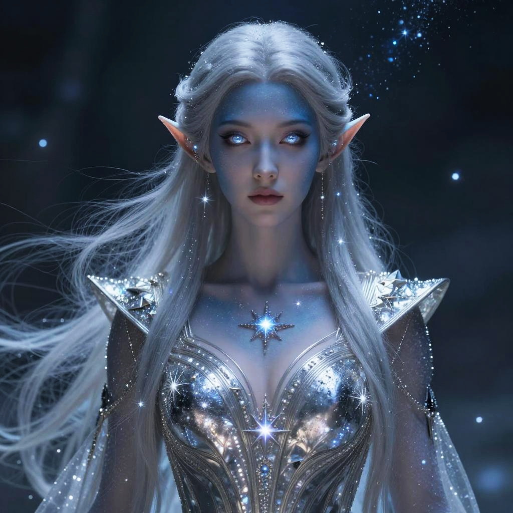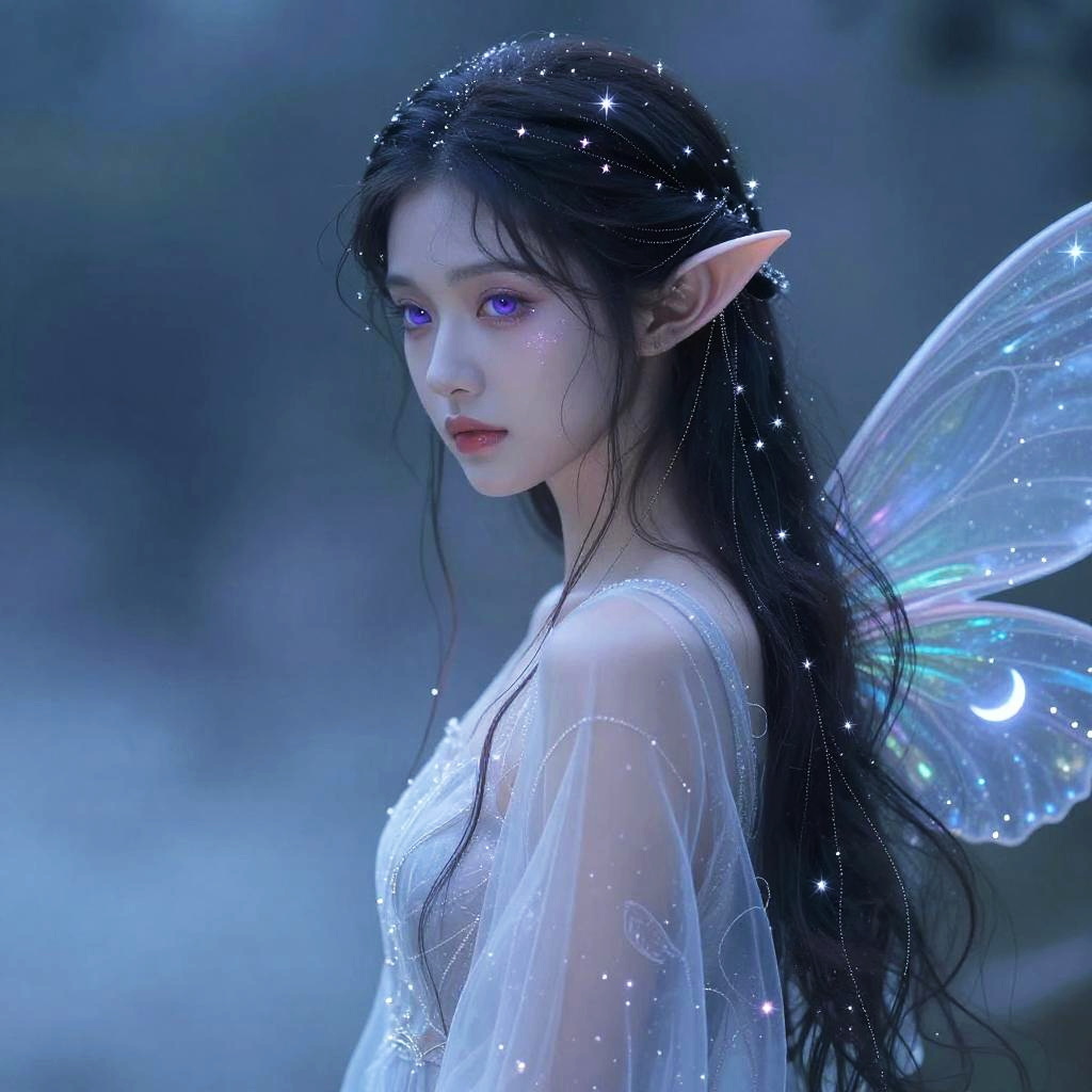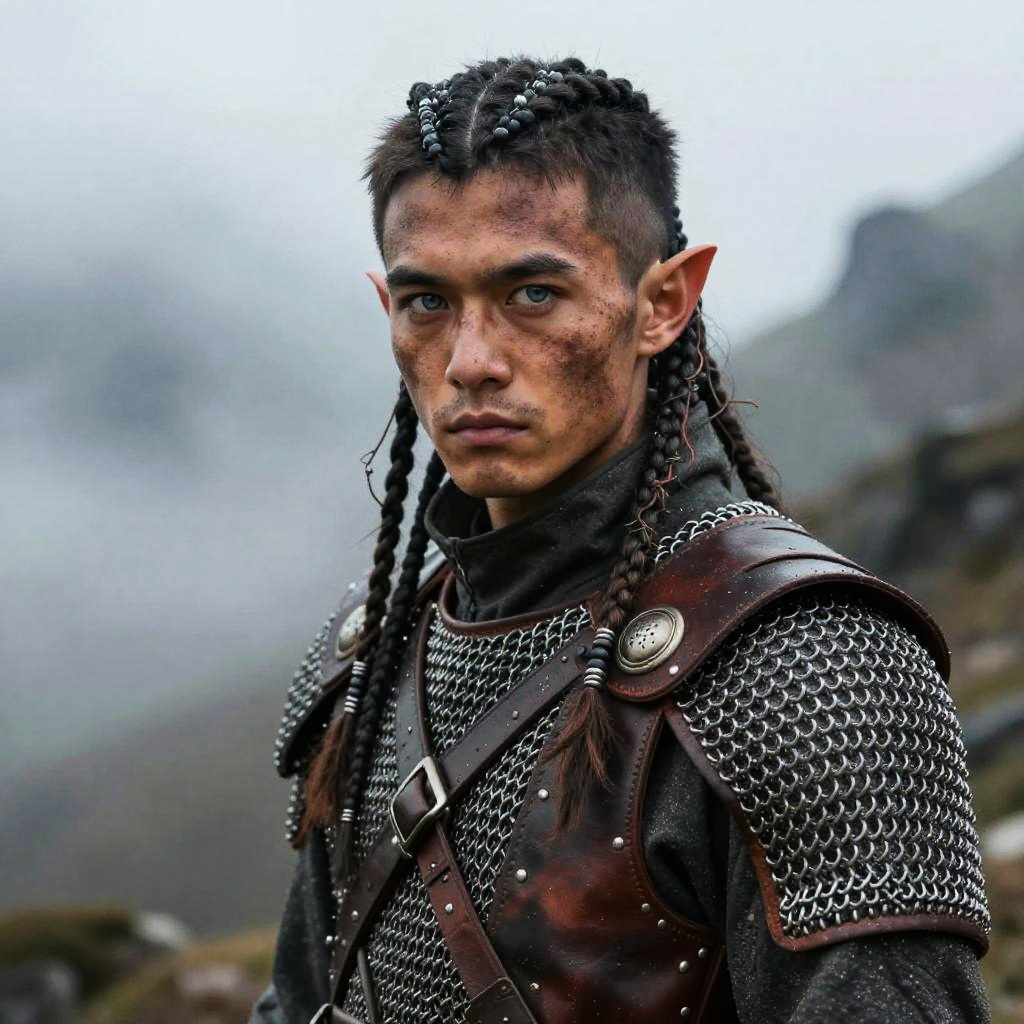 Lithe woodland nymph, with short hair braided with beads and vines, elongated pointed ears, glowing eyes, pale green skin, surrounded by dark ethereal smoke, wearing delicate spider silk gown, detailed and atmospheric