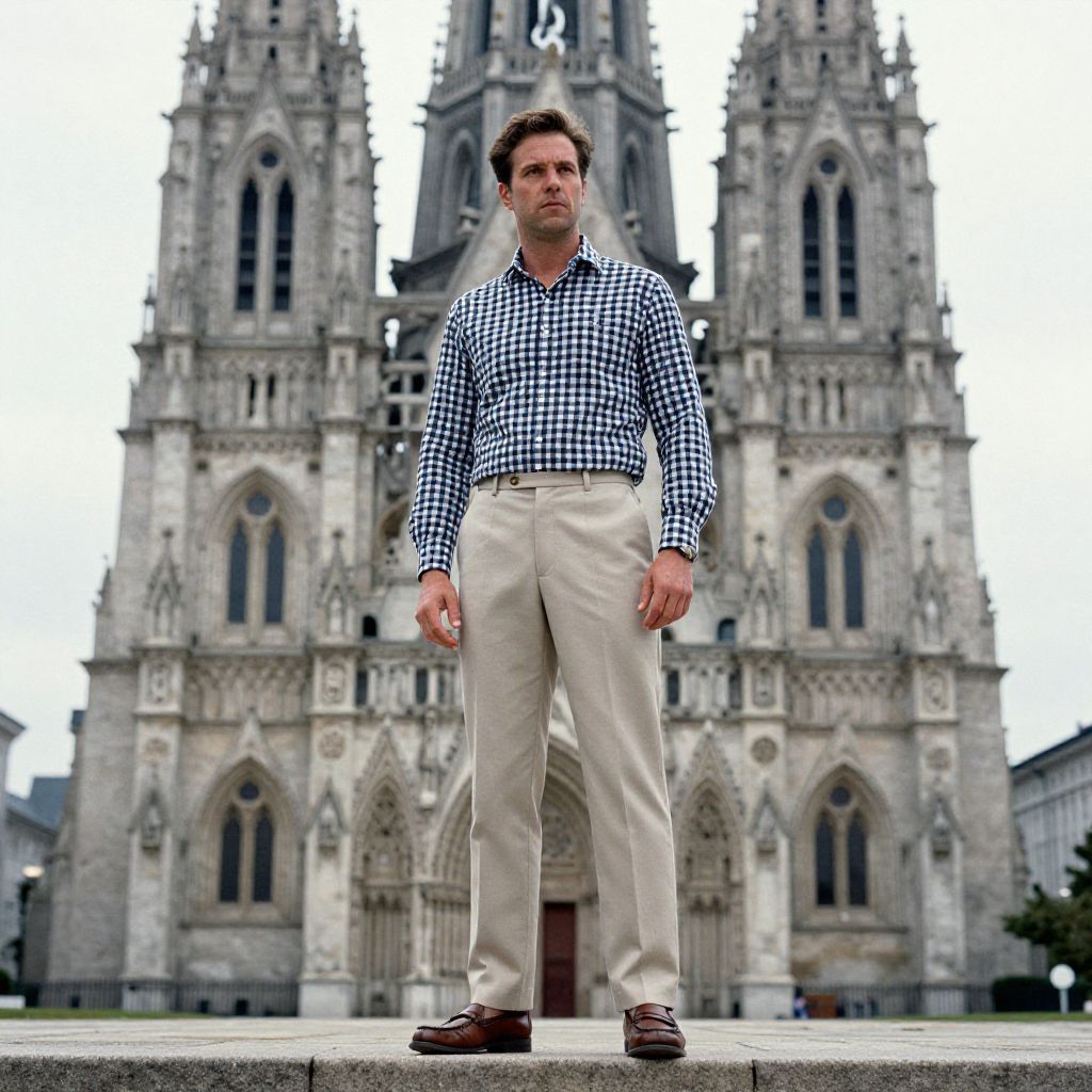 A man, heritage wear gingham shirt in navy and white, tailored beige slacks, brown leather loafers, standing in a majestic stone façade with towering spires, chromogenic film style, contemplative expression. Man has masculine face and piercing eyes