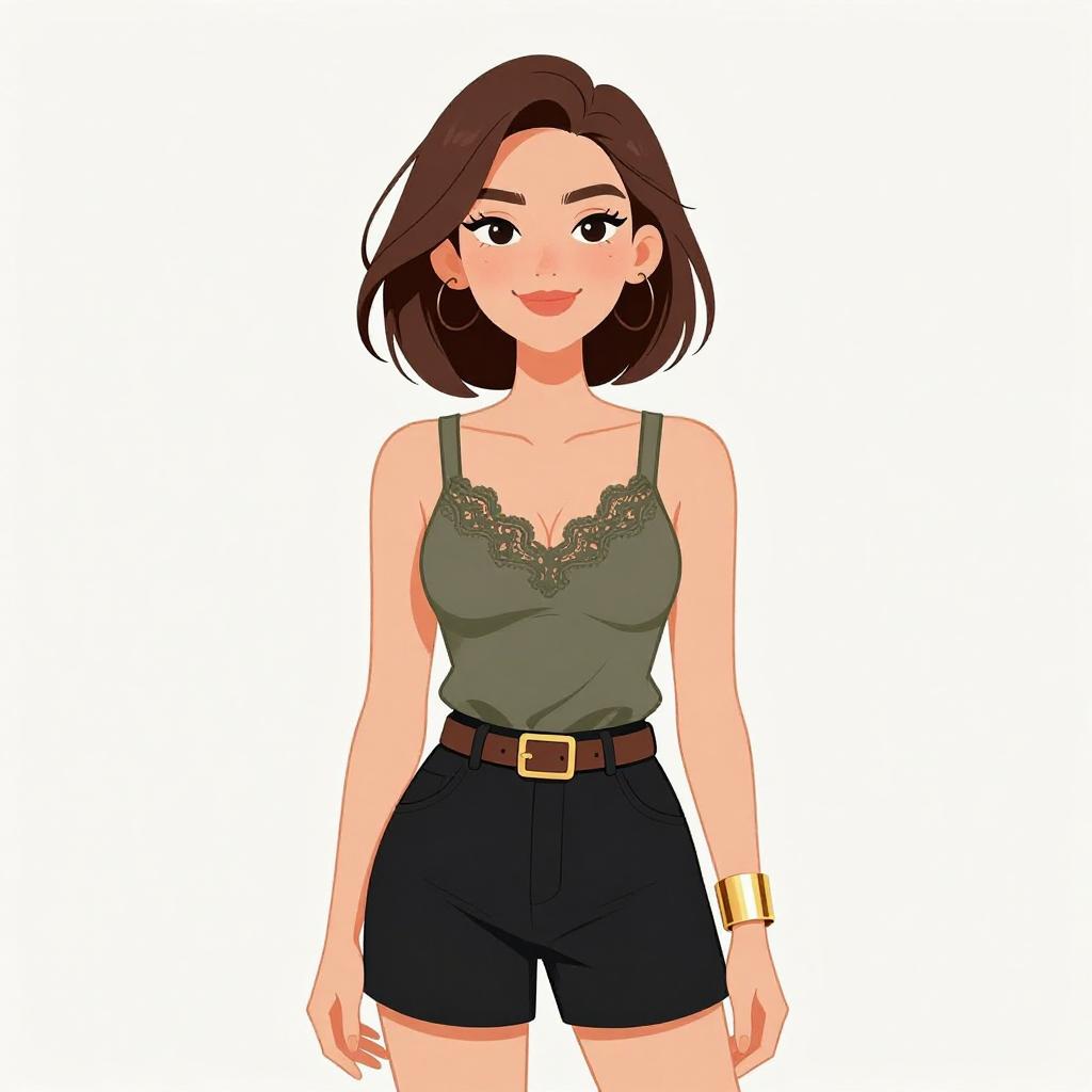 Woman with pretty face and pretty hair. smiling Woman, casual, deep green v-neck camisole with spaghetti straps, wrap style front, paired with high-waisted shorts in a beige and black floral print, relaxed fit, accessorized with a chunky gold bracelet. --sref 1467