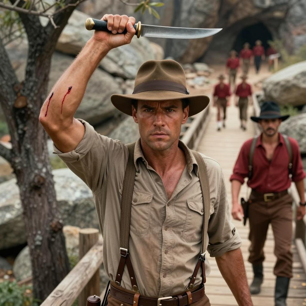 Muscular man with dirty, shirtless brown vest, black strap, and brown hat holds sword. Intense expression. Background: rocky cliff, dense greenery. Wooden bridge leads to group of red-clothed people in distance. Overhead shot. Movie still style.