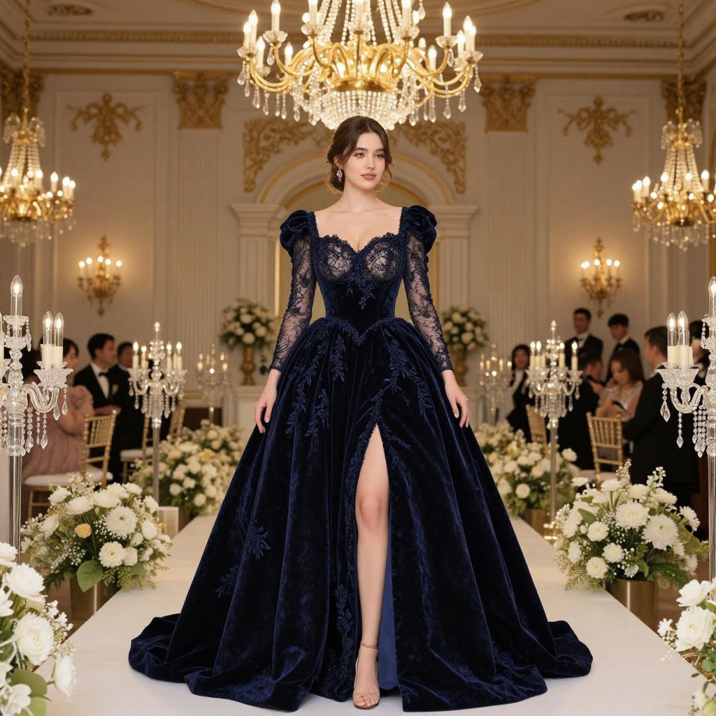 A dramatic wedding dress woman in a deep navy velvet gown with lace detailing, standing under a golden chandelier in a grand ballroom during a black-tie wedding, her face is composed and elegant with soft golden highlights, wearing a sophisticated bridal costume with a high slit and voluminous skirts, surrounded by crystal candle holders and guests in formal attire, creating a luxurious and romantic scene.. The woman has big breasts and cute face