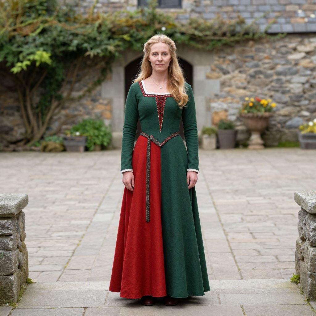 Medieval irish dress, woman in a green and red dress standing in a courtyard