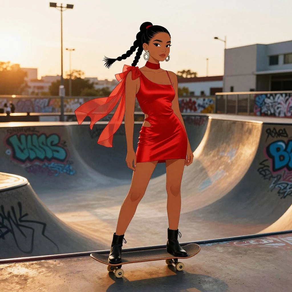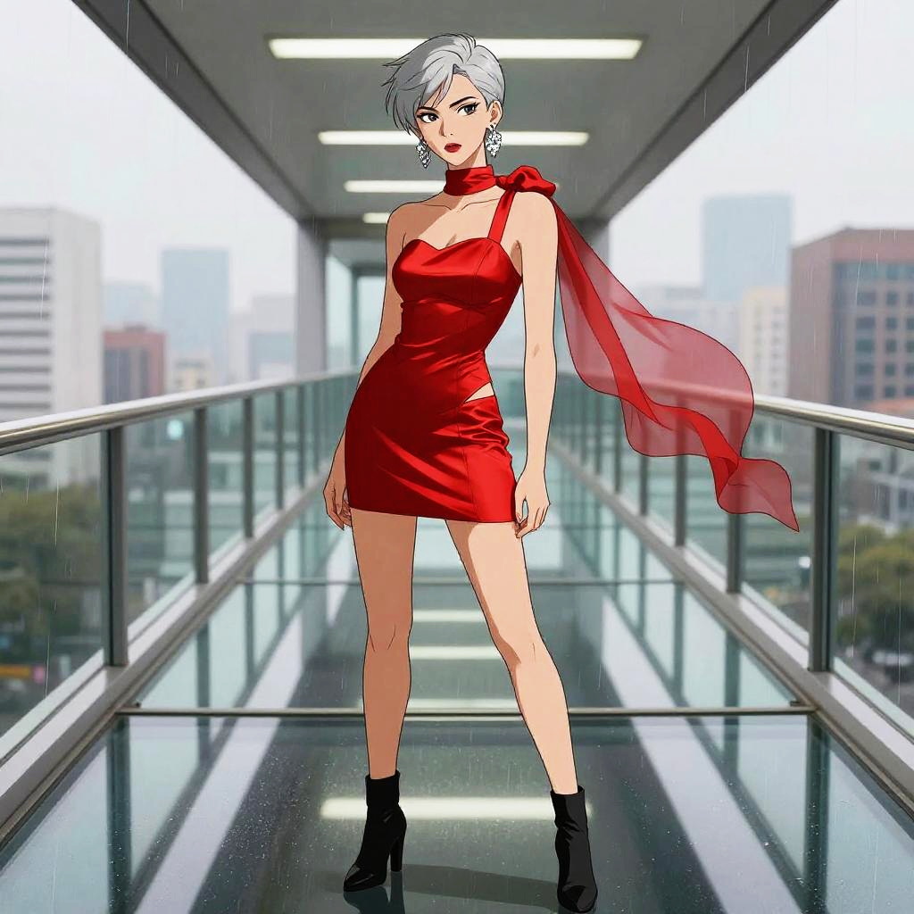 Digital illustration of a red-haired woman in a red, one-shoulder dress with a sheer red scarf, red boots, and earrings, standing confidently