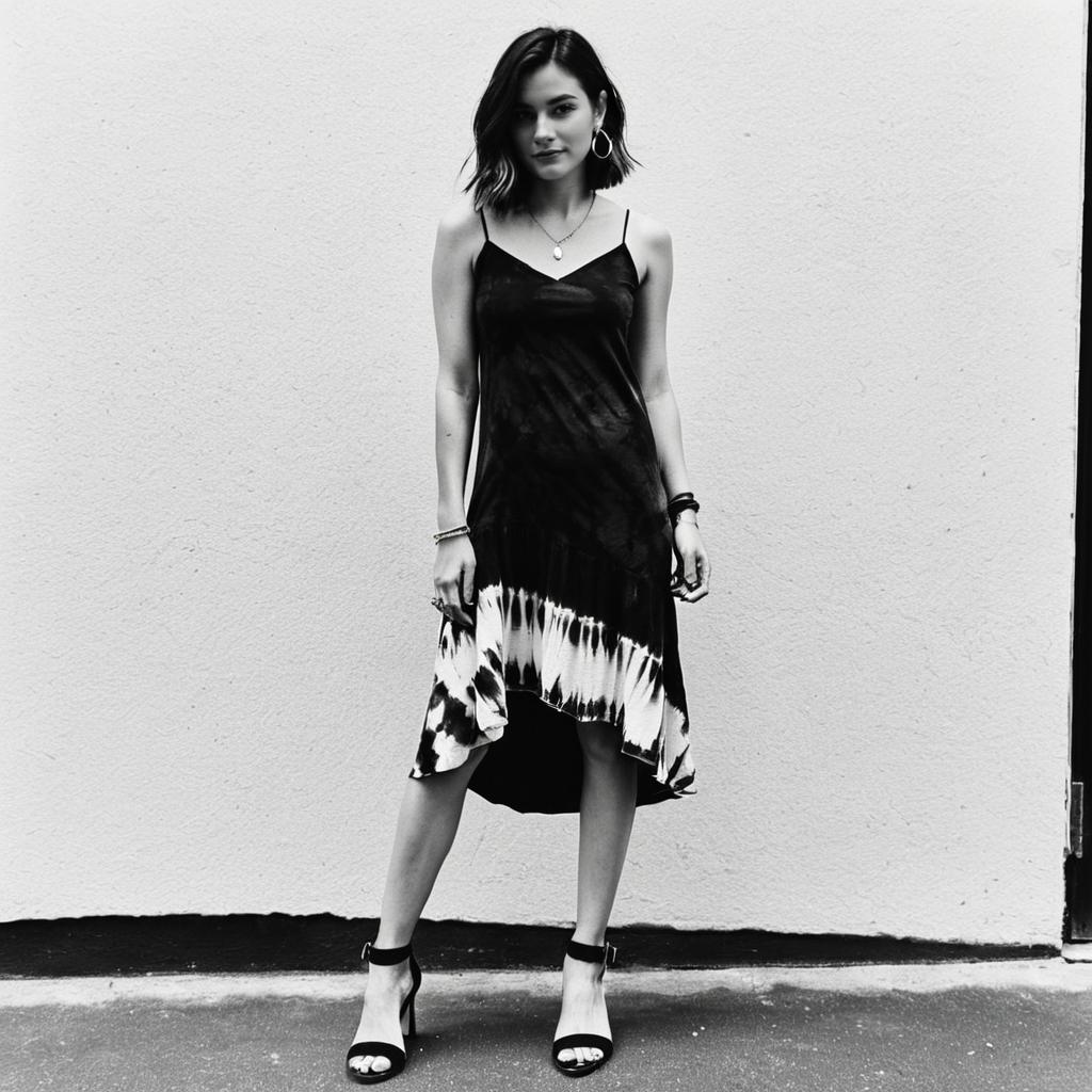 Woman, casual chic, tie-dye knee-length dress in black and white, sleeveless on one side and short sleeve on the other, asymmetrical hemline, black strappy heels, silver bangle bracelet on one wrist.