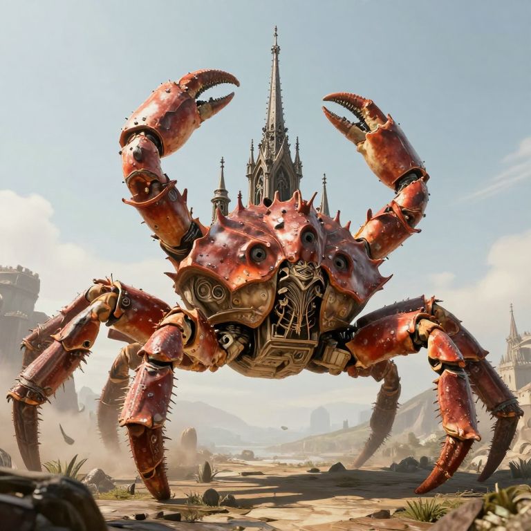 A colossal, mechanical crab towers over a surreal landscape, its massive shell adorned with intricate, gothic-style spires and turrets, defying the boundaries between organic and architectural realms.