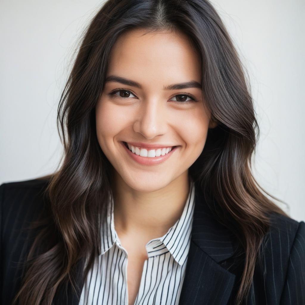 A young woman with long dark hair smiling warmly, wearing a black blazer over a striped top, natural indoor lighting with soft shadows, clean white background, close-up portrait style, showing friendly and approachable expression