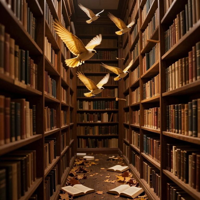 Birds soar gracefully through the hallowed aisles of a dimly lit library, their wings casting golden glows as they navigate between towering wooden bookshelves filled with ancient tomes, while scattered autumn leaves and open books lie strewn across the floor, evoking a sense of timeless wonder and discovery.