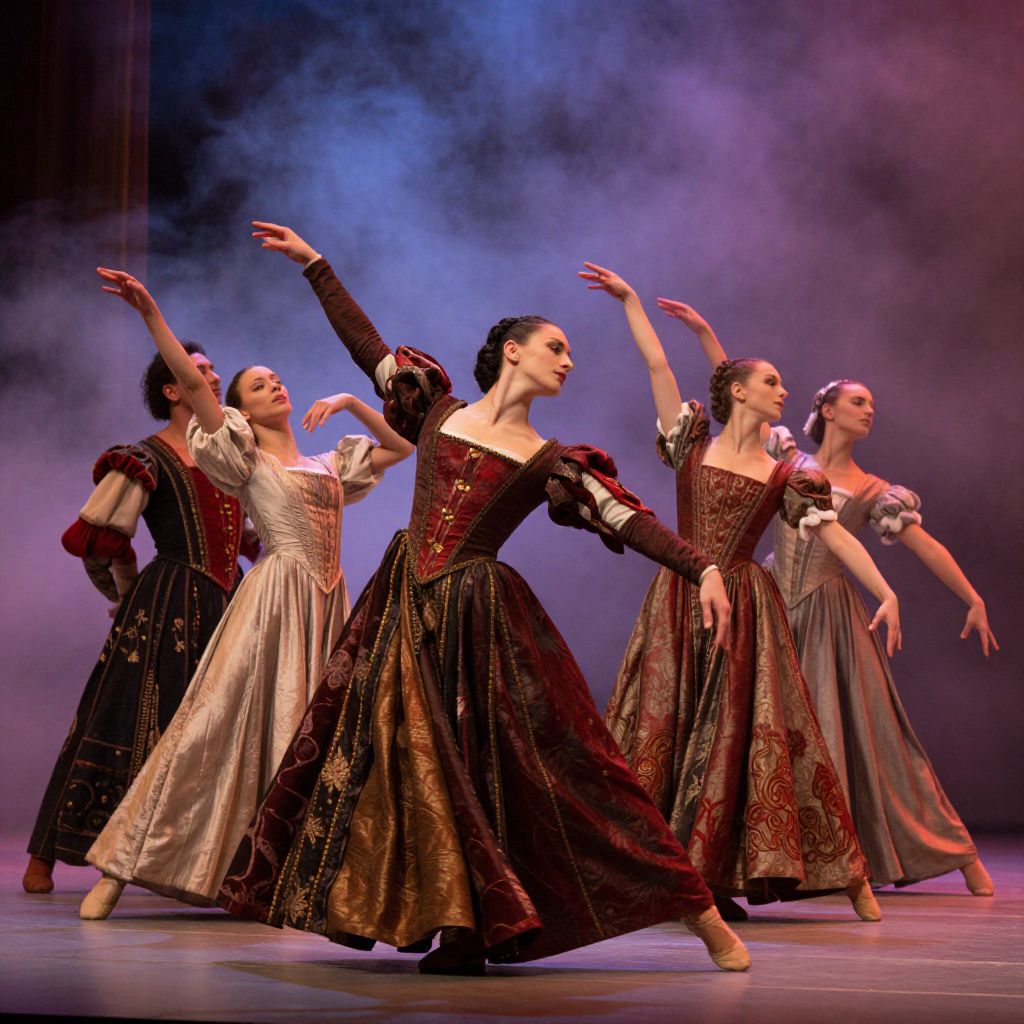 Photograph of five ballerinas in elaborately embroidered Renaissance-style dresses, gracefully dancing in a dramatic, smoky purple and blue stage light.