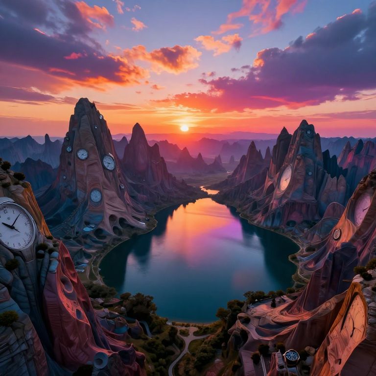Digital art of a surreal sunset over a reflective lake surrounded by clock-faced, rocky mountains with vibrant orange, pink, and purple skies.
