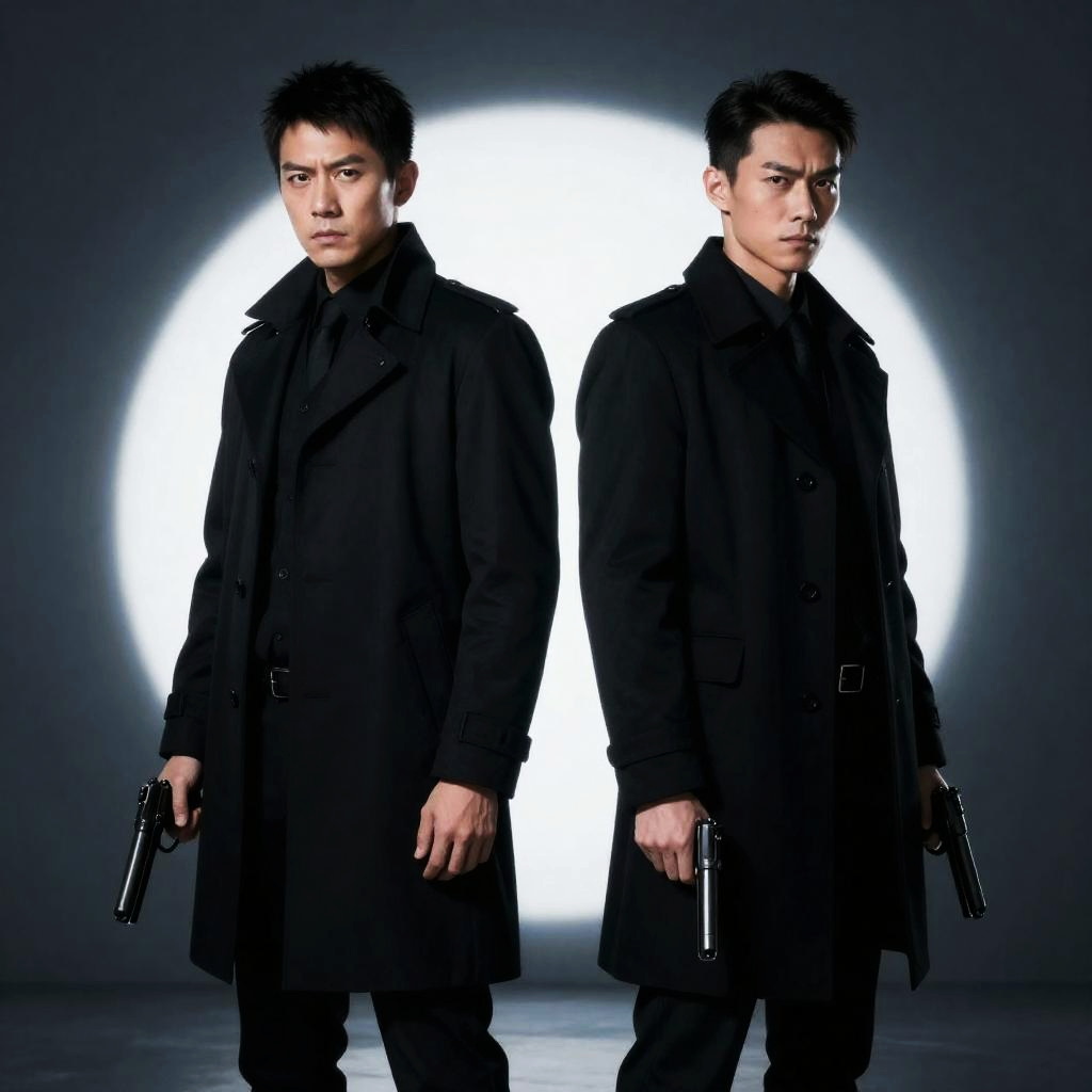 Two men in black, long coats holding guns, standing side by side. Dark background with bright light behind them. Both men have intense expressions, short dark hair, and are positioned facing forward.