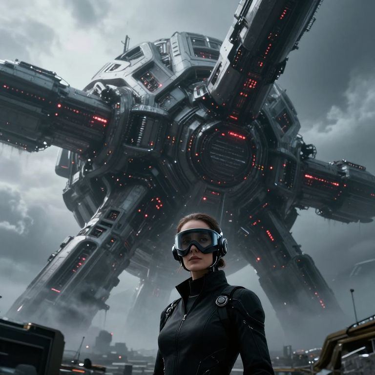 Highly detailed and hyper realistic and dynamic, This is a high-quality cinematic photograph in a sci-fi fantasy style, depicting a bustling spaceport scene, The image features two humanoid characters in the foreground, viewed from behind, The character on the left is a young woman and is dressed in a long, dark cloak, while the character on the right, a male, wears a beige, flowing robe, In the background, a massive, intricate spaceship hovers above the scene, with various smaller spacecraft and flying vehicles scattered throughout the sky, The port is crowded and filled with life, The sky itself is filled with a mix of cloudy and clear areas, adding depth to the composition, Sky high illuminated buildings are visible in the far distance, The lighting is soft, with a cool color palette, primarily blues and grays, which gives the image a serene yet futuristic atmosphere, The background is detailed, with a moderate depth of field keeping both the characters and the background elements in focus, The aesthetic quality of the image is very high, with a professional and polished look that showcases a cohesive and immersive sci-fi environment
