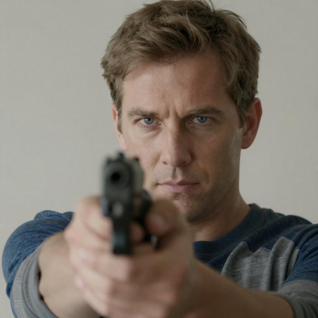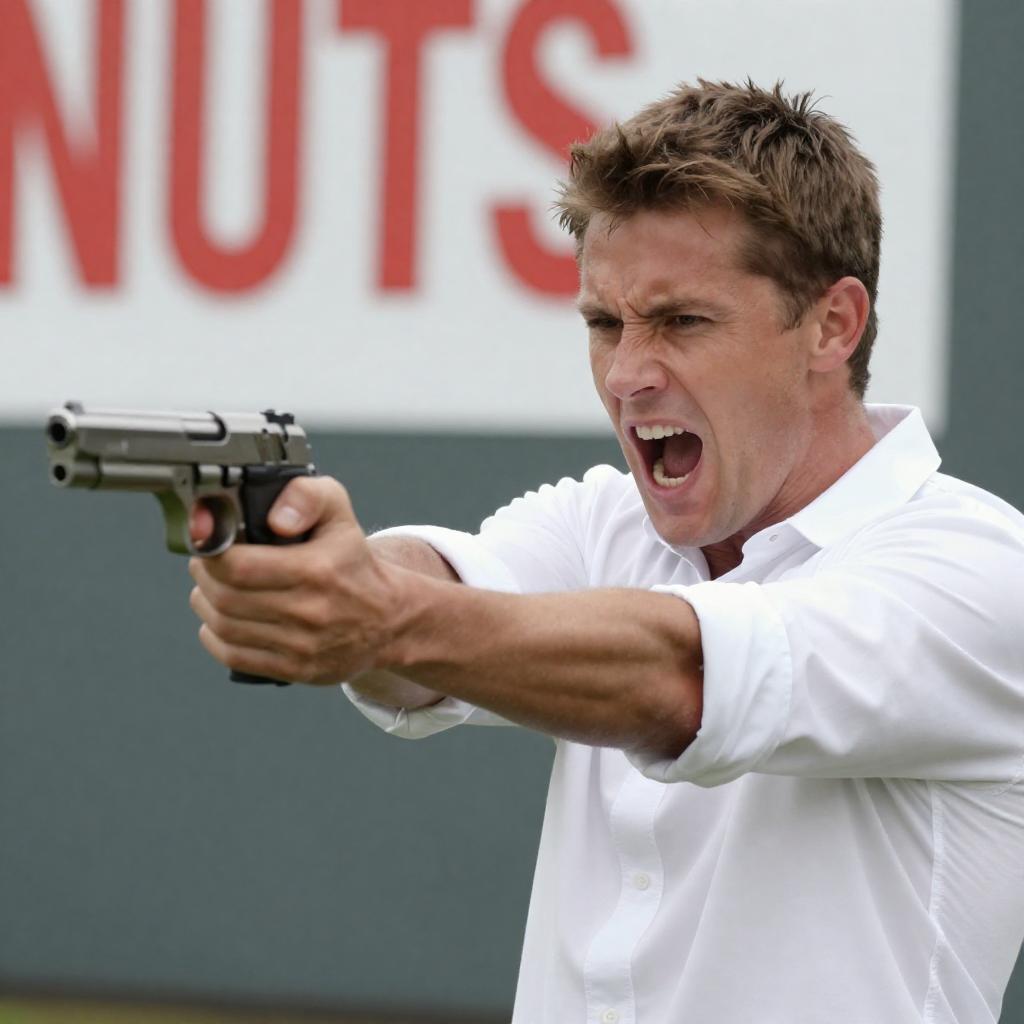 Photograph of a white man with short brown hair, wearing a white shirt, pointing a silver handgun aggressively while shouting with an open mouth. Background includes a blurred sign with "NUTS" in red letters. Bright, high-contrast lighting emphasizes his intense expression and action.