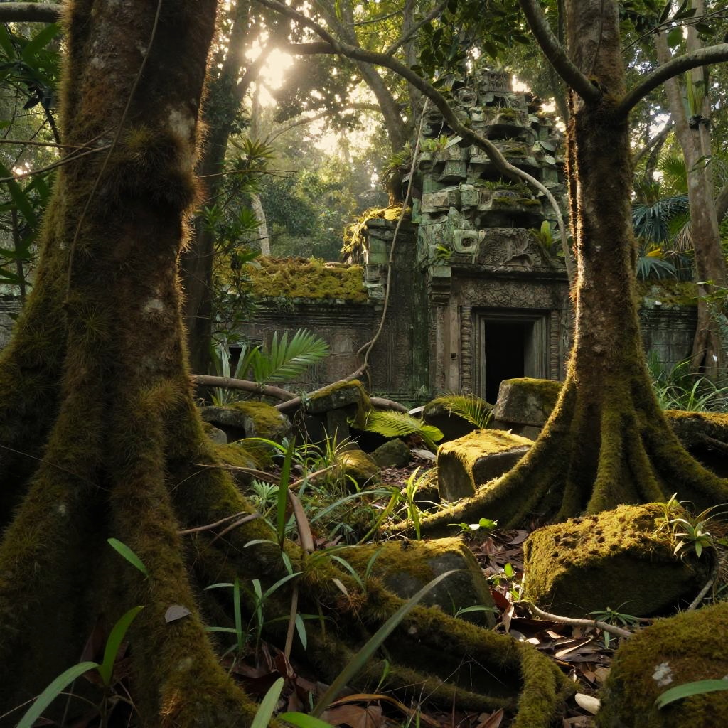 Hairy jungle environment with wild dense brush covered in thick fur-like moss, ancient ruins partially covered by hairy vines, soft golden sunlight breaking through the treetops