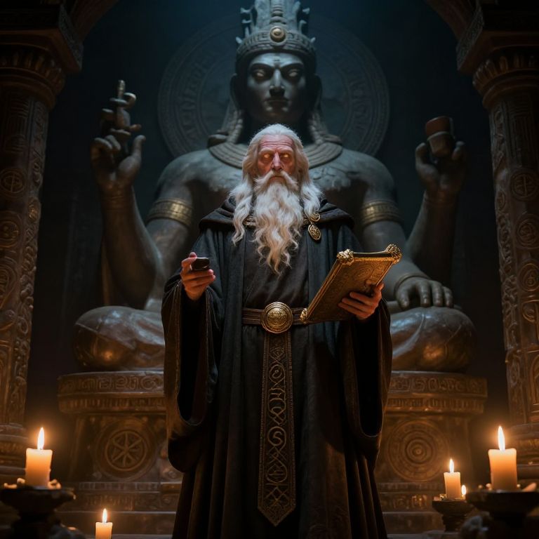 Cleric fantasy art of an ancient temple guardian, a wise elder with glowing eyes and a sacred tome, standing before a colossal statue of a deity, surrounded by flickering candles and mystical sigils, atmospheric and mysterious ambiance.
