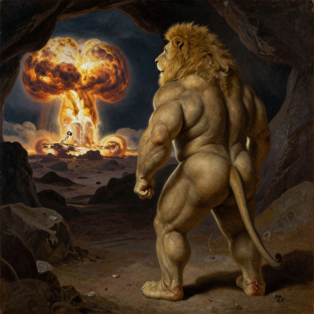 Muscular Lion Hunter Witnessing Nuclear Blast
