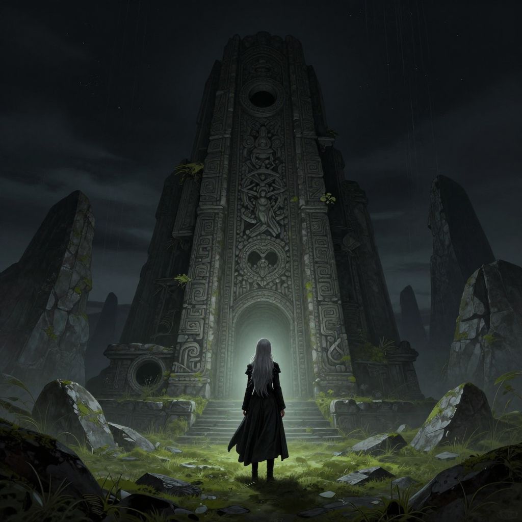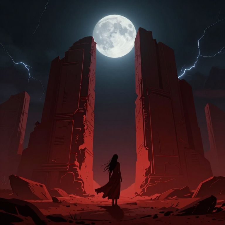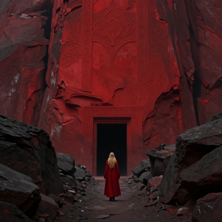 This digital artwork depicts a mysterious, red-hued cave with intricate, ornate carvings adorning the walls. A lone figure, a woman with long, blonde hair, stands facing a dark, rectangular doorway at the center. She wears a long, red robe that contrasts against the rocky, black and red surroundings. The rocky terrain on either side of the narrow path leading to the doorway is textured and jagged. The overall scene is dark and evocative, with deep reds and blacks dominating the color palette, creating a sense of foreboding and mystery. The art style is realistic with a fantasy element.