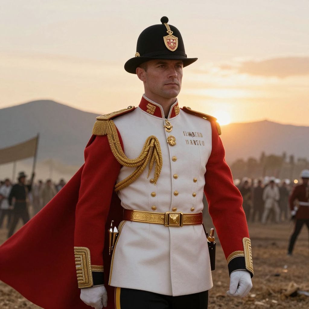 A distinguished man in a detailed red and white military uniform with a red cape flowing gracefully behind him, adorned with gold embroidery and a ceremonial gold belt. He wears a black fedora-style hat with a prominent gold emblem featuring a stylized shield and crown, giving him a commanding and noble appearance. The scene is set in a sunlit battlefield with distant mountains and a golden sunset, emphasizing his heroic and authoritative presence.