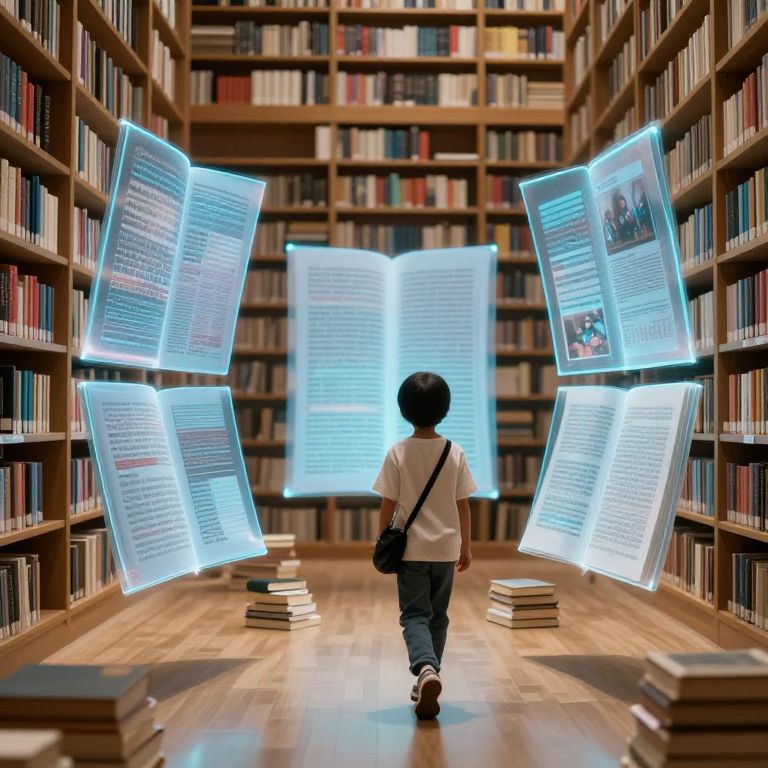 A library where books float mid-air, their stories unfolding in 3D holographic narratives that readers can walk through and interact with.