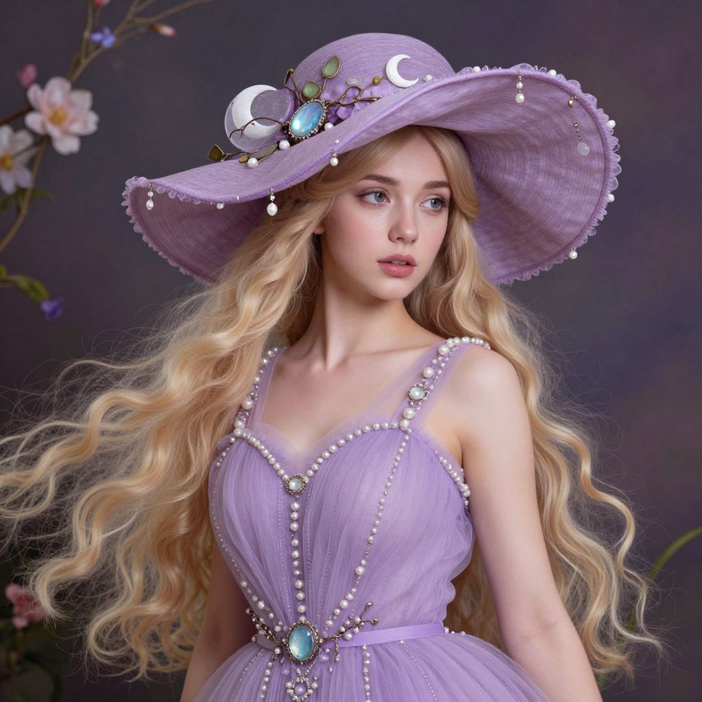 Portrait of a young woman with long flowing blonde hair wearing an elegant large lilac hat adorned with moonstone beads and vine leaves. She is dressed in a matching soft lilac tulle dress featuring pearl embellishments and intricate detailing. The image has a dreamy, fantasy art style background with rich lighting and a smooth skin texture, surrounded by delicate floral elements. This digital painting showcases vibrant color harmony and an ornate, elegant composition.