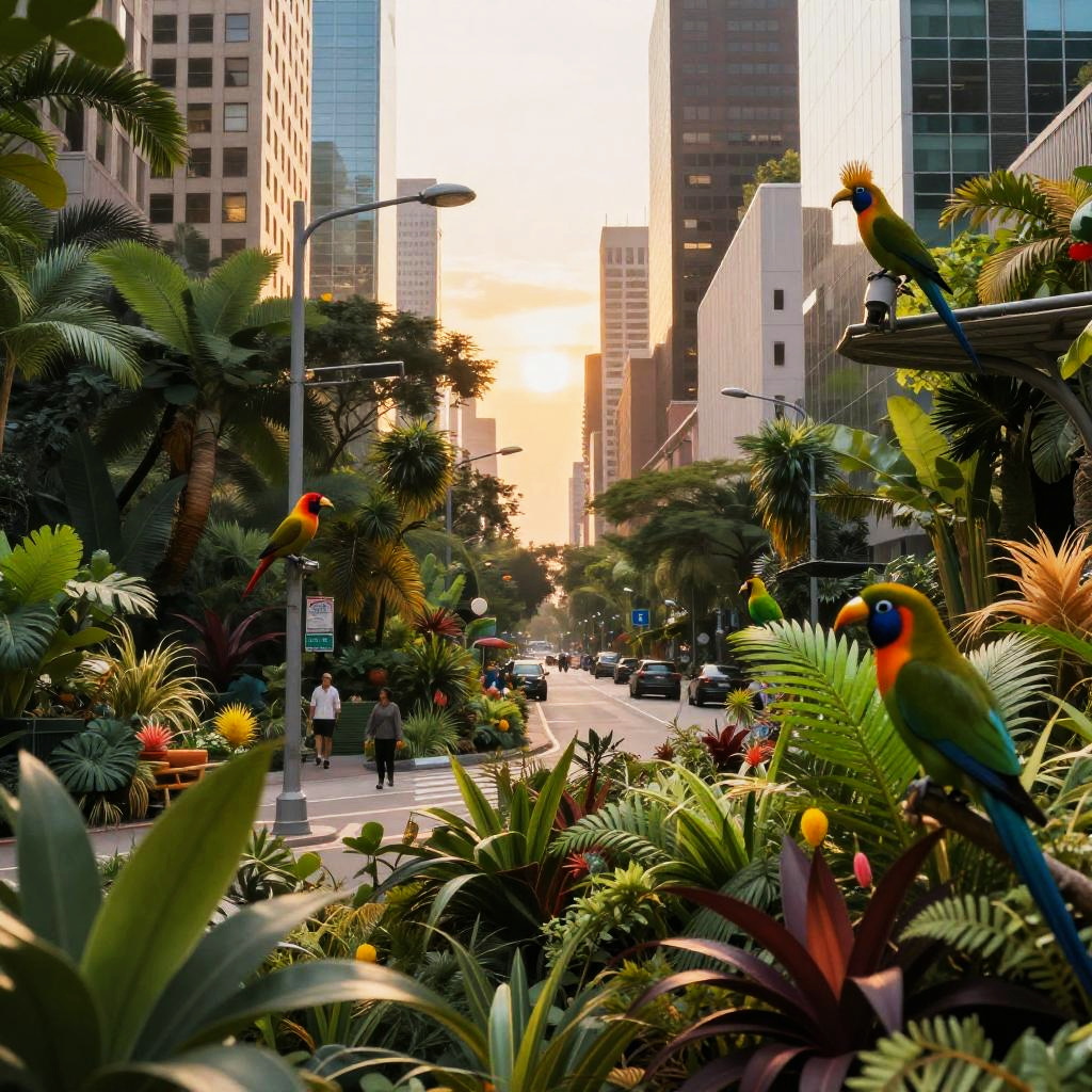 An immersive urban jungle experience showing a bustling city street overtaken by wild greenery, colorful exotic birds perched on streetlights, soft golden sunset glow highlighting nature's reclaim