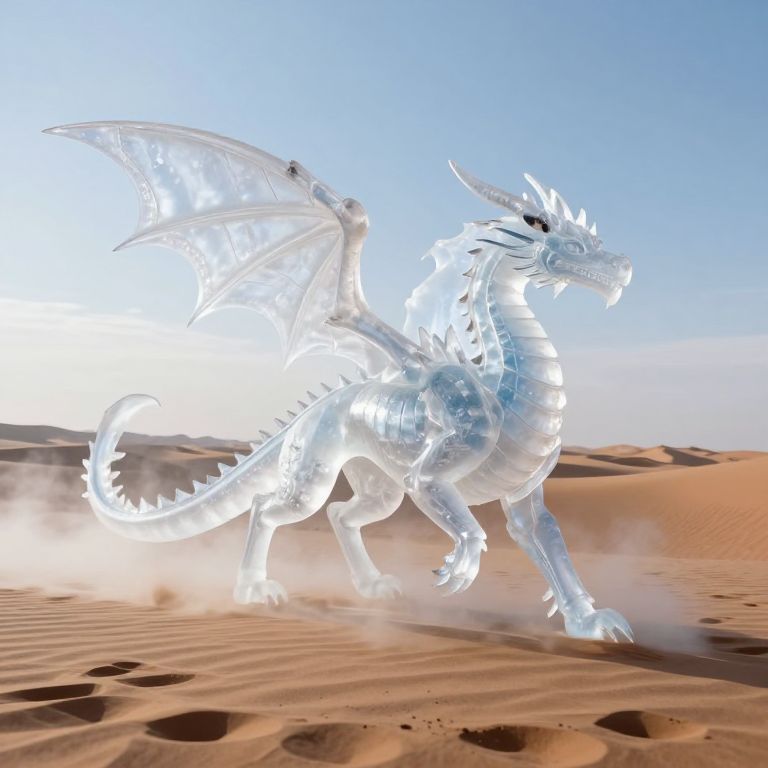 Translucent ice dragon strides gracefully through a vast desert landscape, its crystalline body emitting ethereal fog that drifts across the sandy terrain beneath a serene sky.