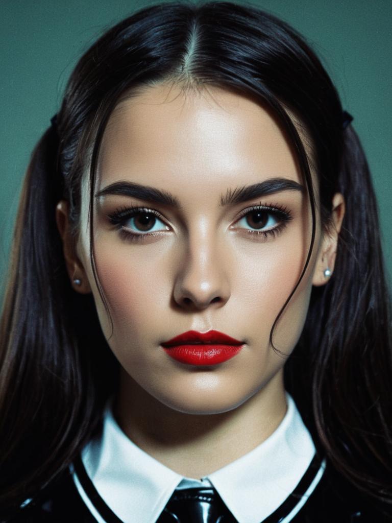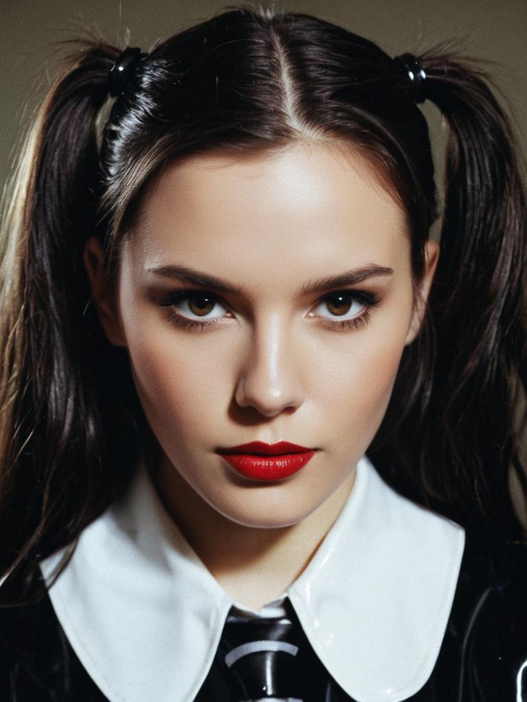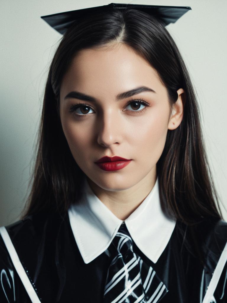 Woman in Latex Schoolgirl Costume, close-up detailed headshot, photorealistic realism