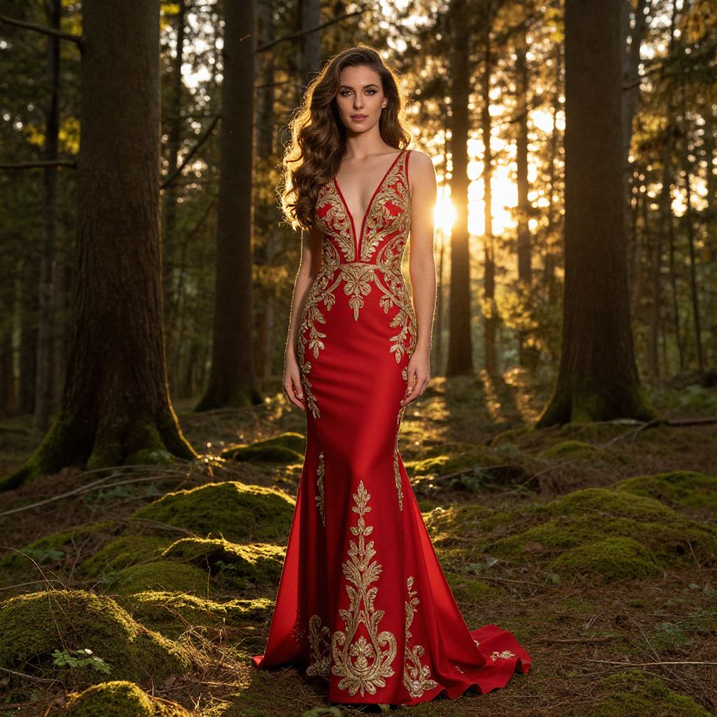 A stunning woman with long, wavy hair wearing a deep V-cut red evening gown with intricate gold embroidery stands gracefully in a lush forest at sunset. The golden sunlight filters through the tall trees, highlighting the vibrant colors of the dress and casting a warm glow on the moss-covered forest floor. The scene showcases ultra-realistic textures and natural light, blending elegance with the beauty of nature.