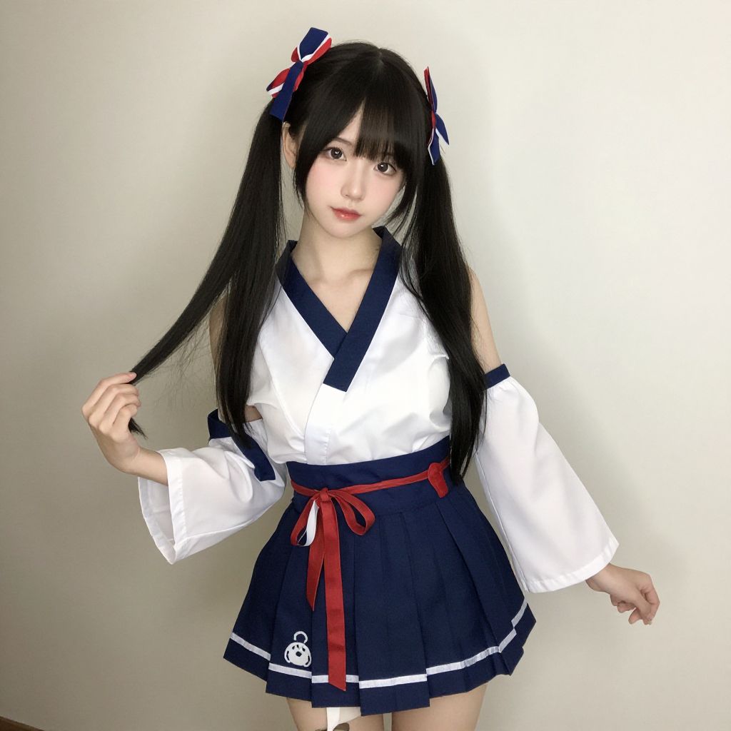 Photograph of an Asian woman with black twin pigtails, wearing a black and white lace-trimmed maid outfit, smiling softly in a plain
