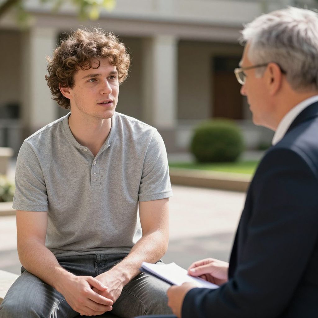 Side Part Ivy League, fit European man, having a quiet conversation with a professor in a sunlit courtyard, realistic photography with natural textures