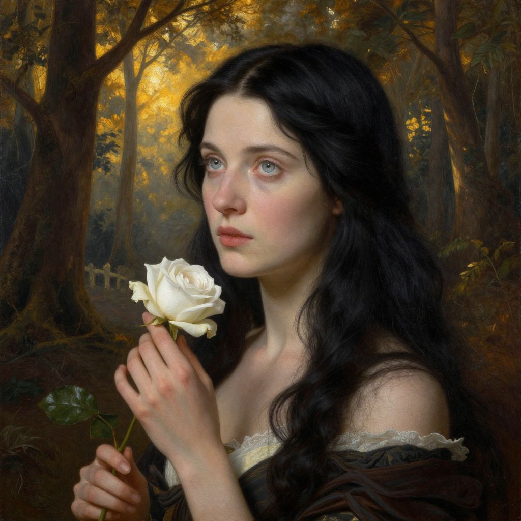 Create a photorealistic portrait reminiscent of classical oil paintings, focusing on intricate details and dynamic lighting. Depict a Western European woman with captivating silver-blue eyes and delicate features; her long raven hair falls gracefully to her waist, gently framing her face. She stands amidst an ancient forest glade, bathed in the warm golden light of dawn filtering through the canopy above. Her expression exudes serenity and a touch of enigma as she gazes pensively into the distance, fingers lightly caressing a single white rose with velvety petals that contrast against her pale skin.