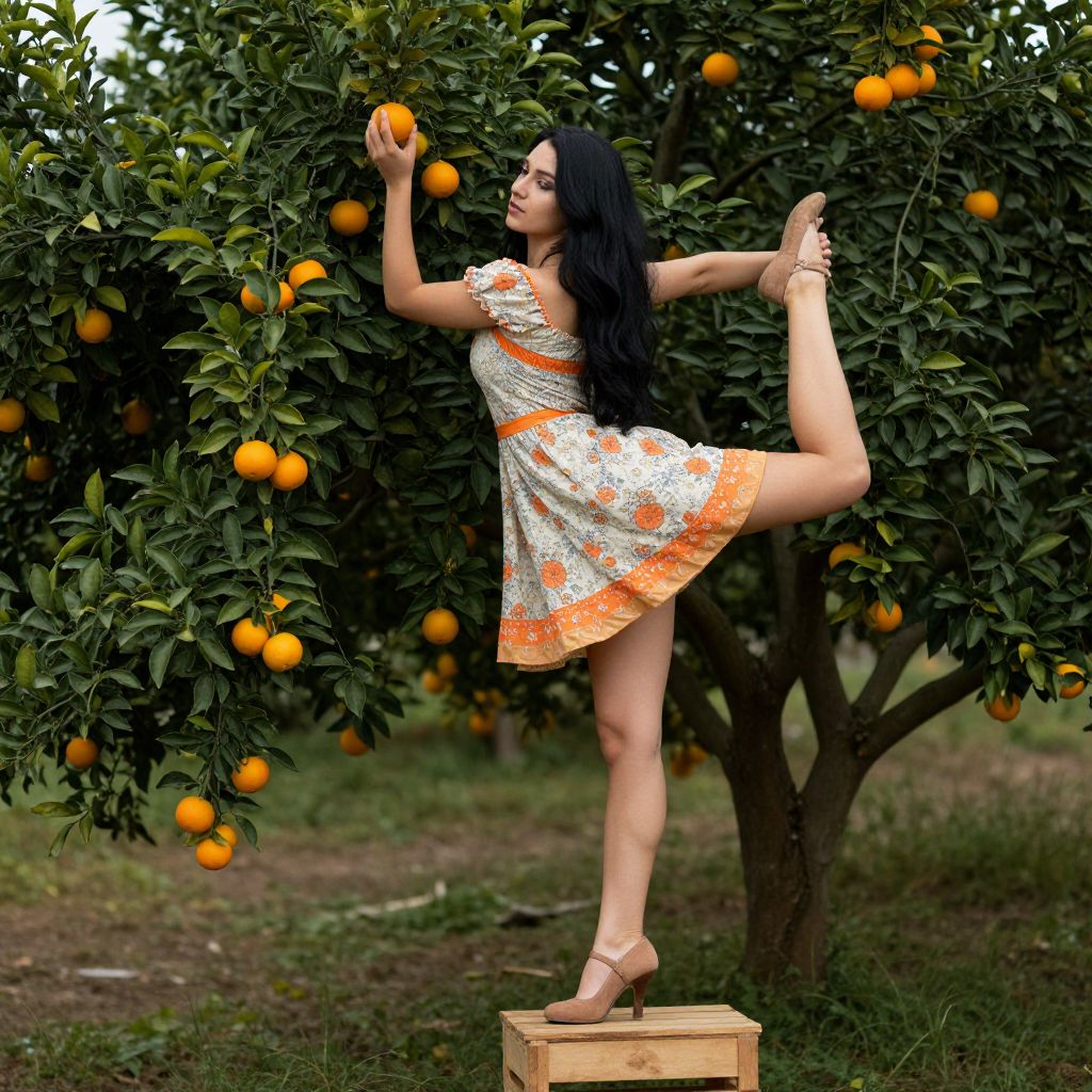 The image depicts a strikingly beautiful woman with long, dark hair, standing on a small wooden crate. She is wearing a summer dress with a floral pattern and orange accents, complemented by a pair of Mary Jane shoes. The woman is positioned in a dynamic pose, stretching on tiptoes and looking over her shoulder, her back to the camera as she faces it. She appears to be picking an orange from an orange tree, with several ripe oranges hanging from the branches. The scene is rich in detail, with the vibrant oranges contrasting against the lush green leaves of the tree. The overall composition is balanced, with the woman centrally positioned and the tree providing a natural backdrop. The interplay of colors, textures, and shapes creates a visually appealing and harmonious image.