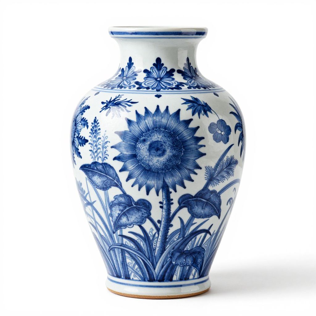 A classic blue-and-white ceramic vase featuring a hand-painted floral design inspired by traditional Delftware, showcasing a central sunflower surrounded by detailed foliage and grasses against a pristine white background, exemplifying high-definition craftsmanship and timeless elegance.