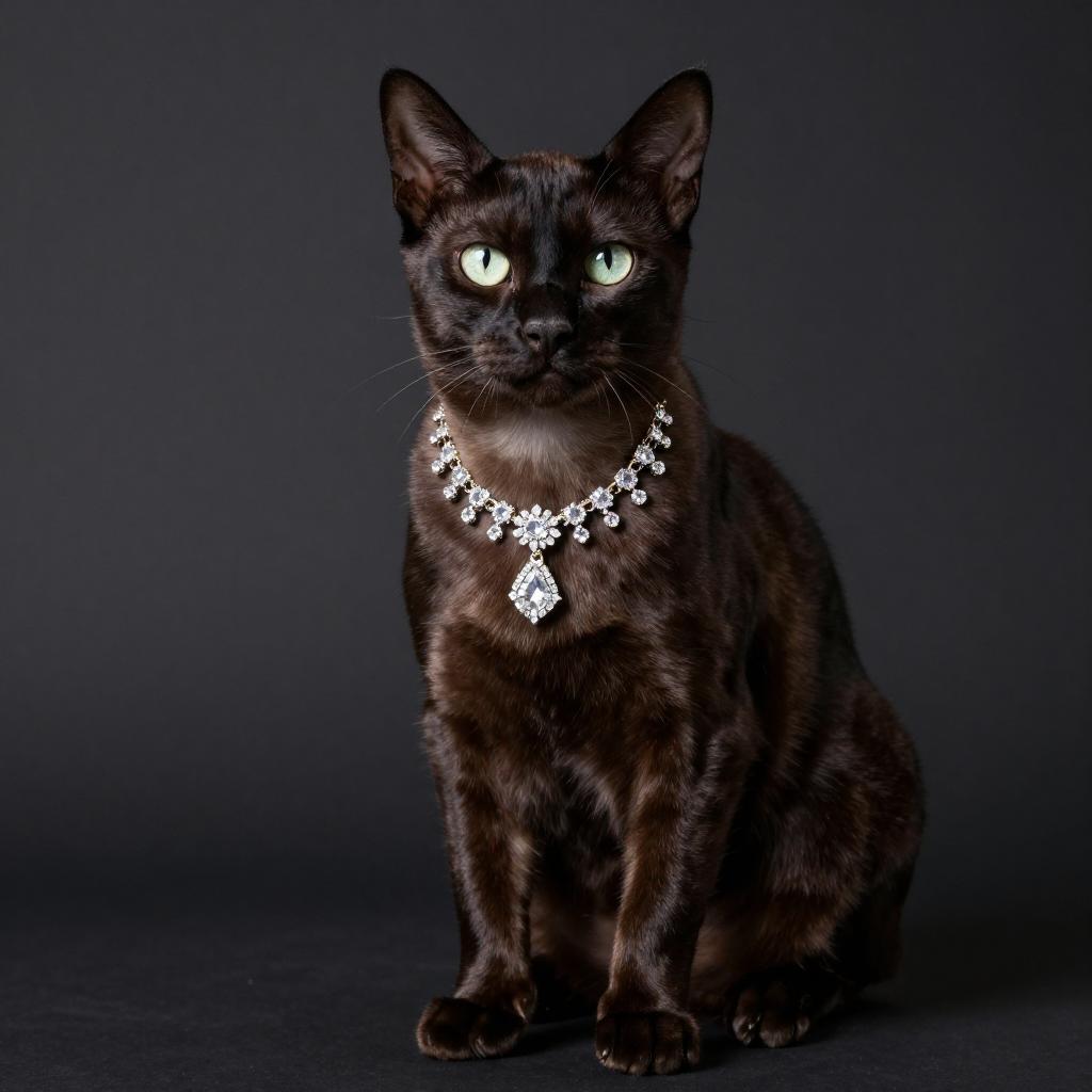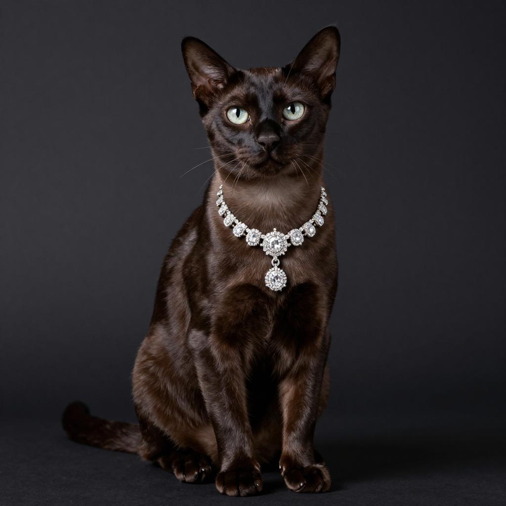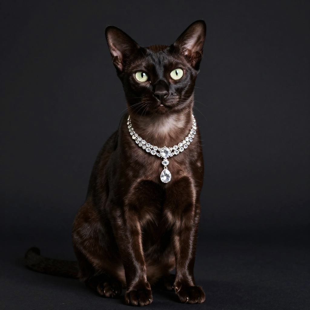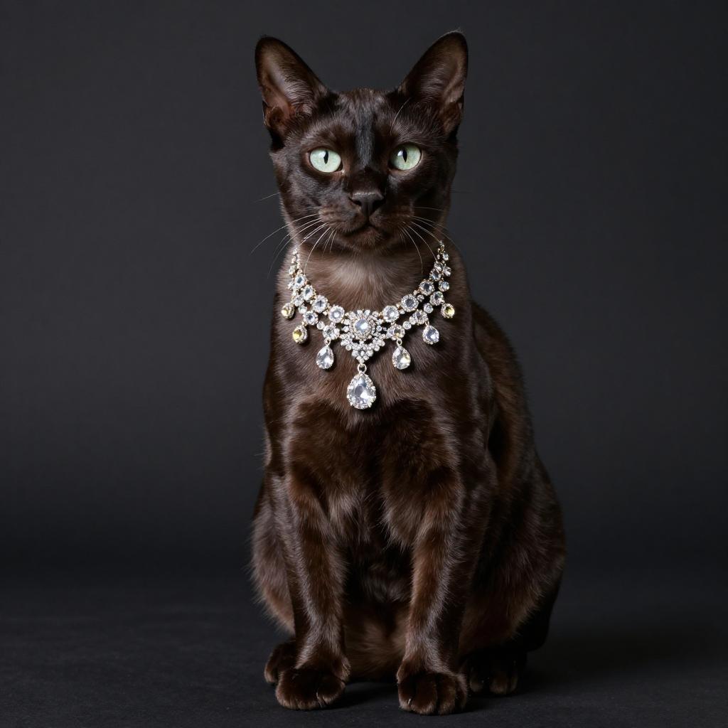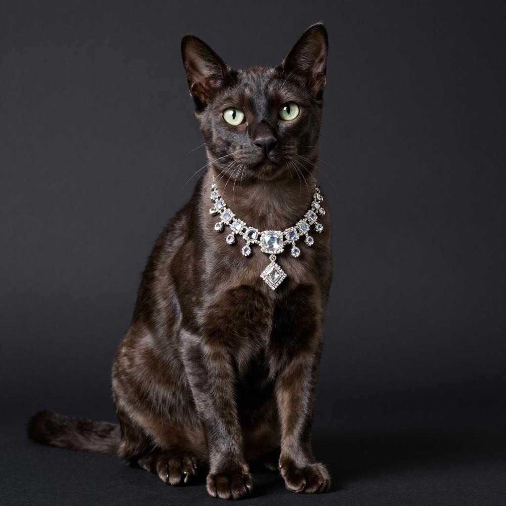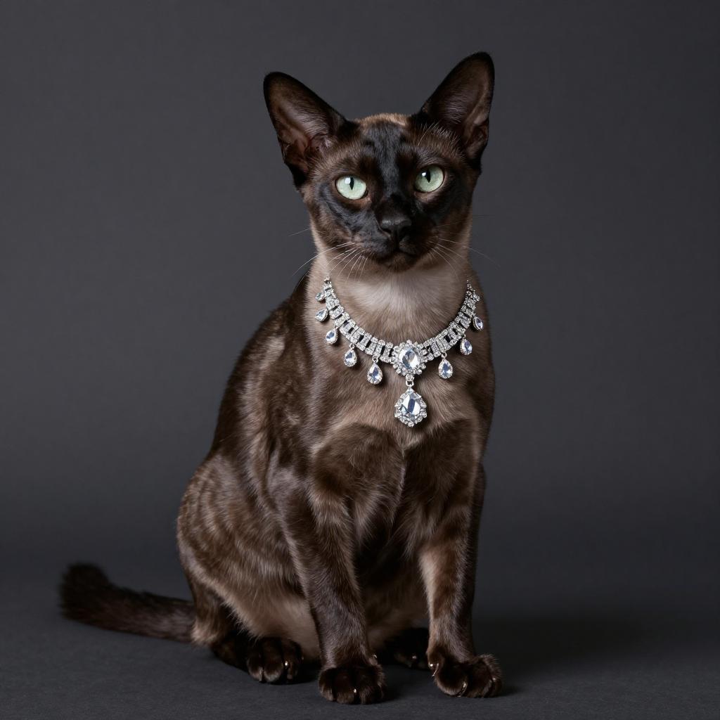 Luxurious studio portrait of a Oriental Shorthair cat sitting upright, glossy dark fur, wearing an ornate sparkling diamond necklace, clean dark background with spotlight, high-end fashion pet photography, high resolution, ultra-detailed