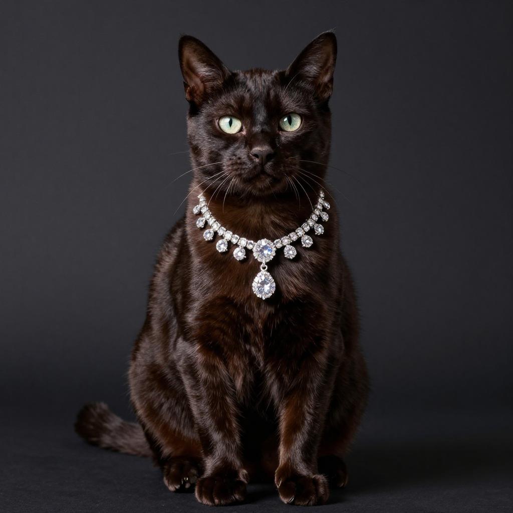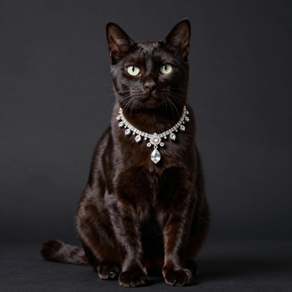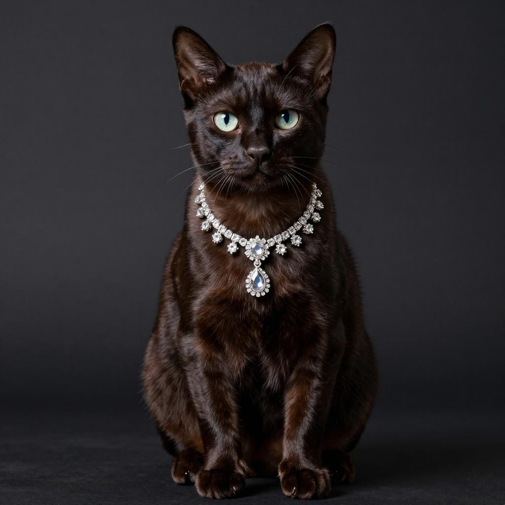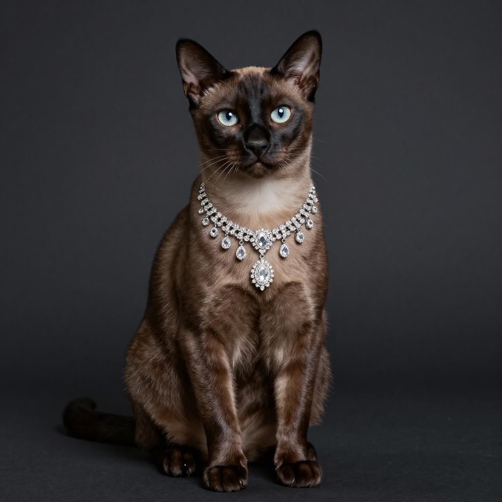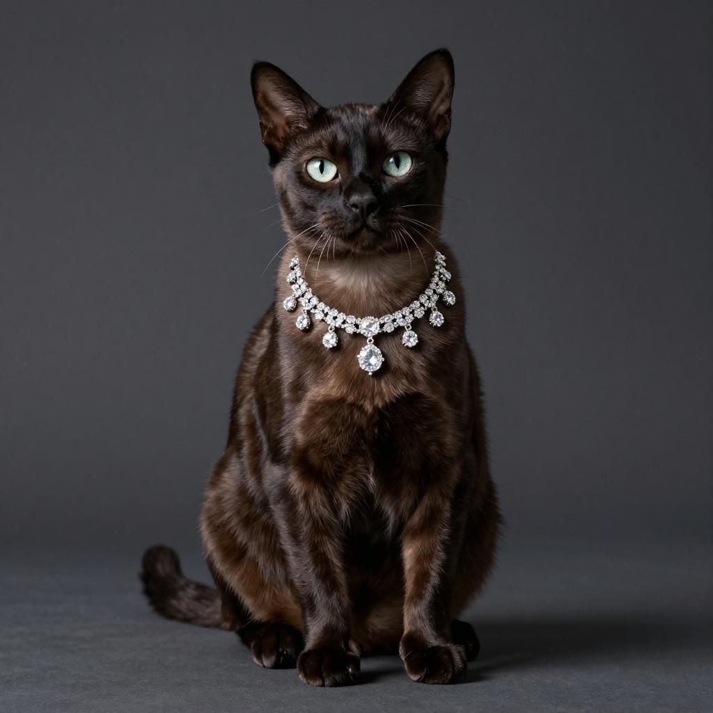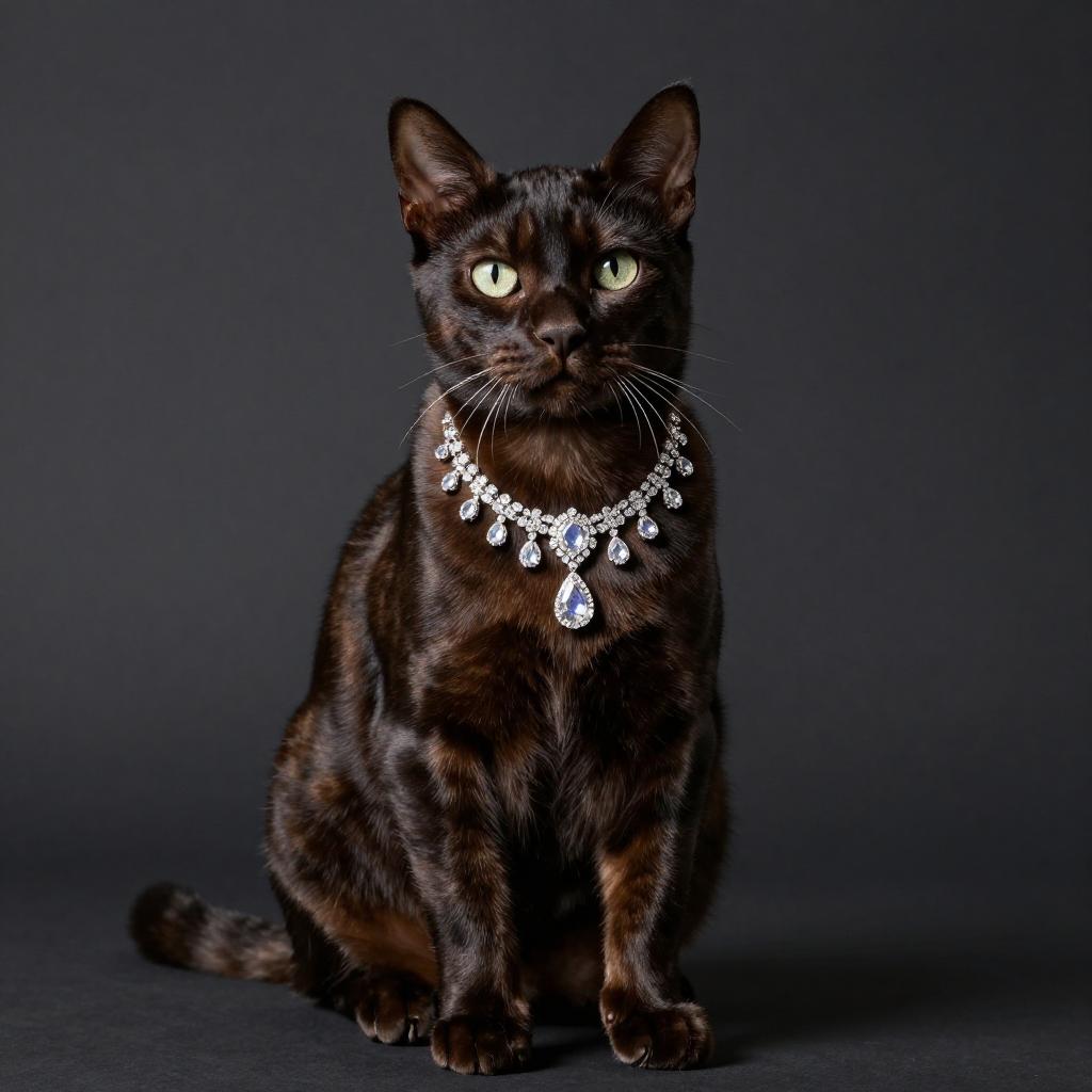 Luxurious studio portrait of a Oriental Shorthair cat sitting upright, glossy dark fur, wearing an ornate sparkling diamond necklace, clean dark background with spotlight, high-end fashion pet photography, high resolution, ultra-detailed