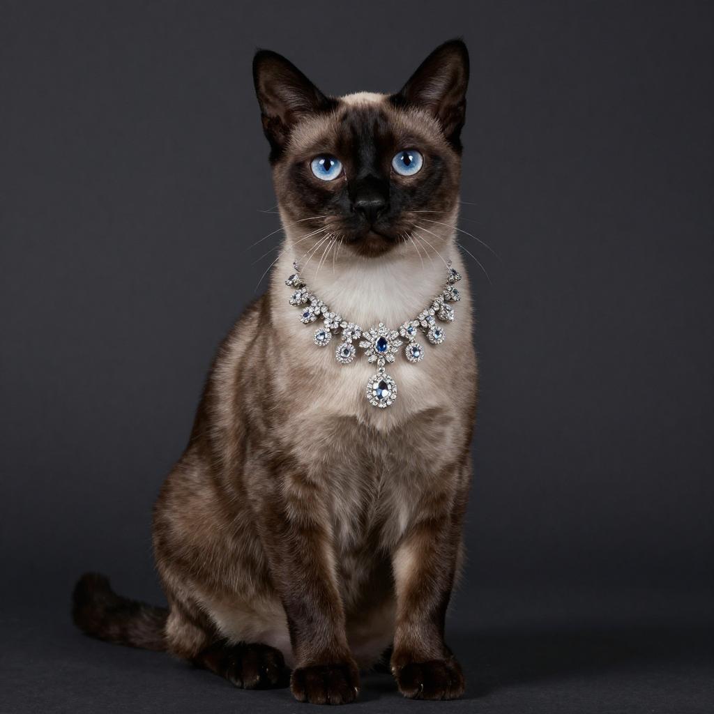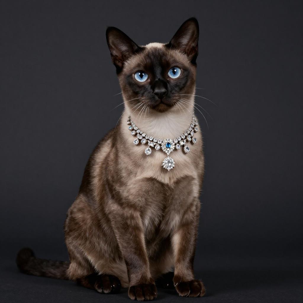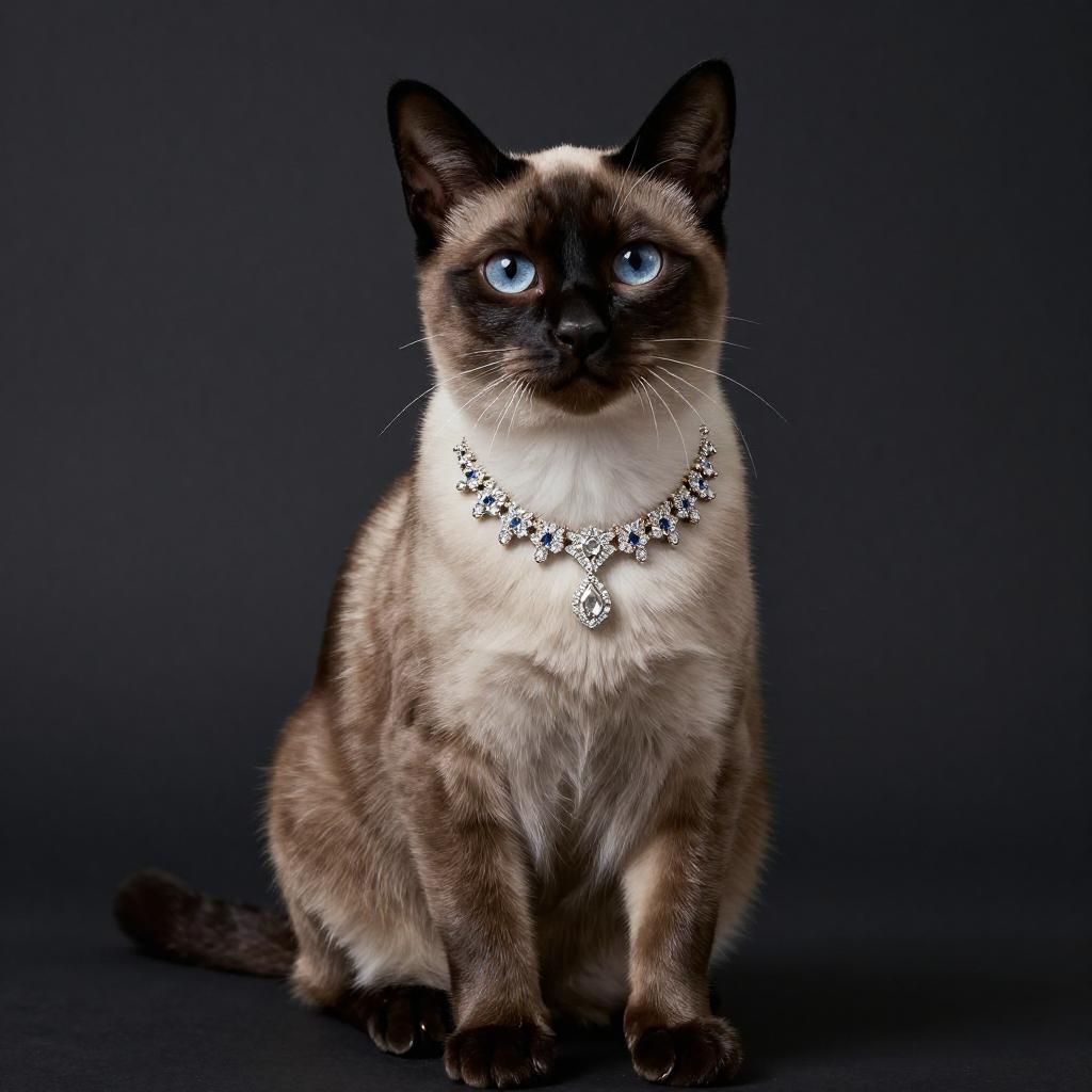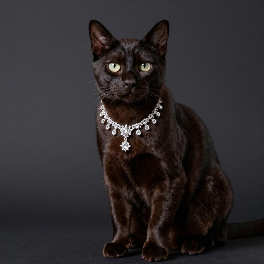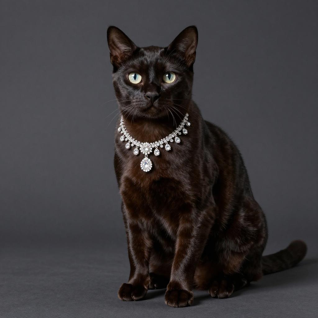 Luxurious studio portrait of a Oriental Shorthair cat sitting upright, glossy dark fur, wearing an ornate sparkling diamond necklace, clean dark background with spotlight, high-end fashion pet photography, high resolution, ultra-detailed