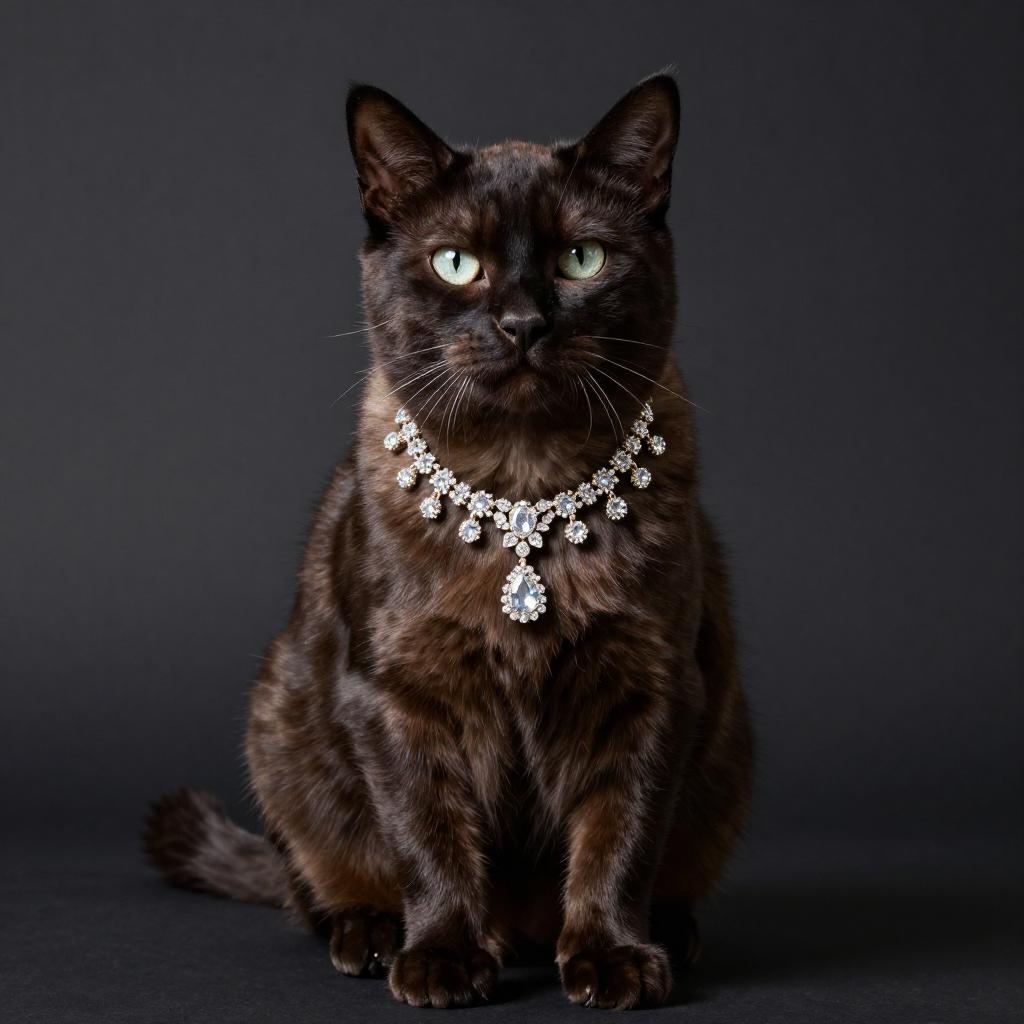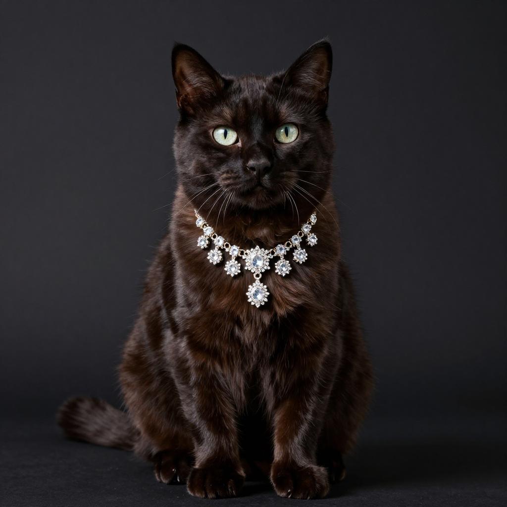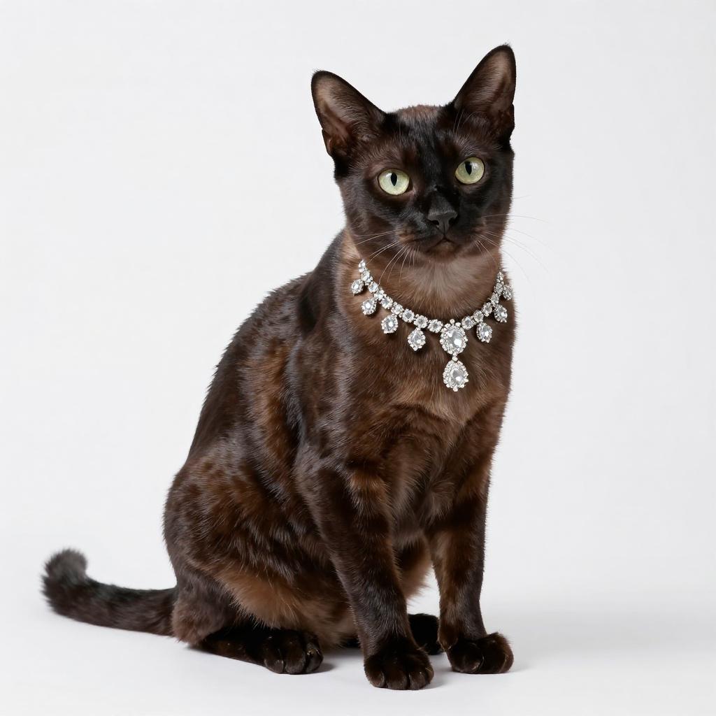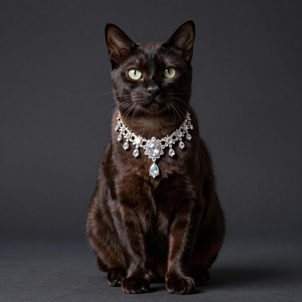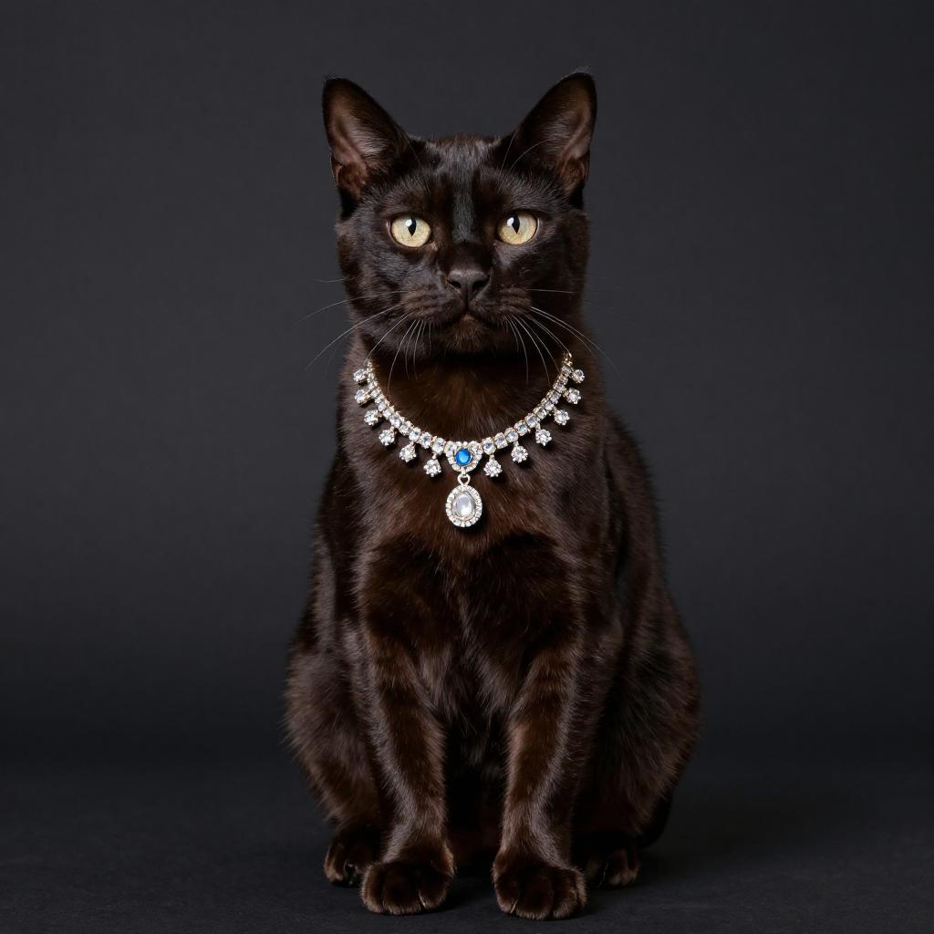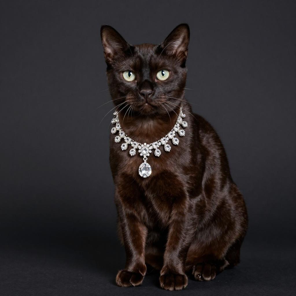 Luxurious studio portrait of a Oriental Shorthair cat sitting upright, glossy dark fur, wearing an ornate sparkling diamond necklace, clean dark background with spotlight, high-end fashion pet photography, high resolution, ultra-detailed