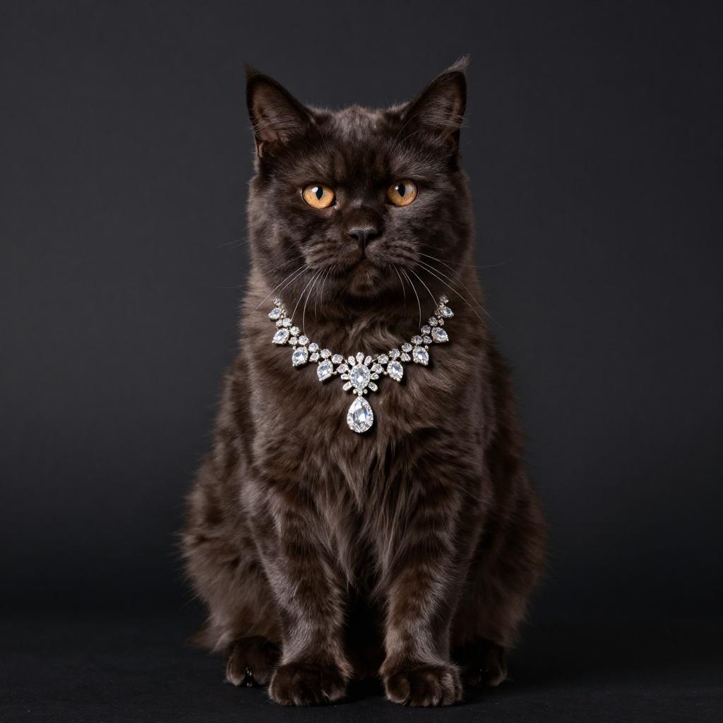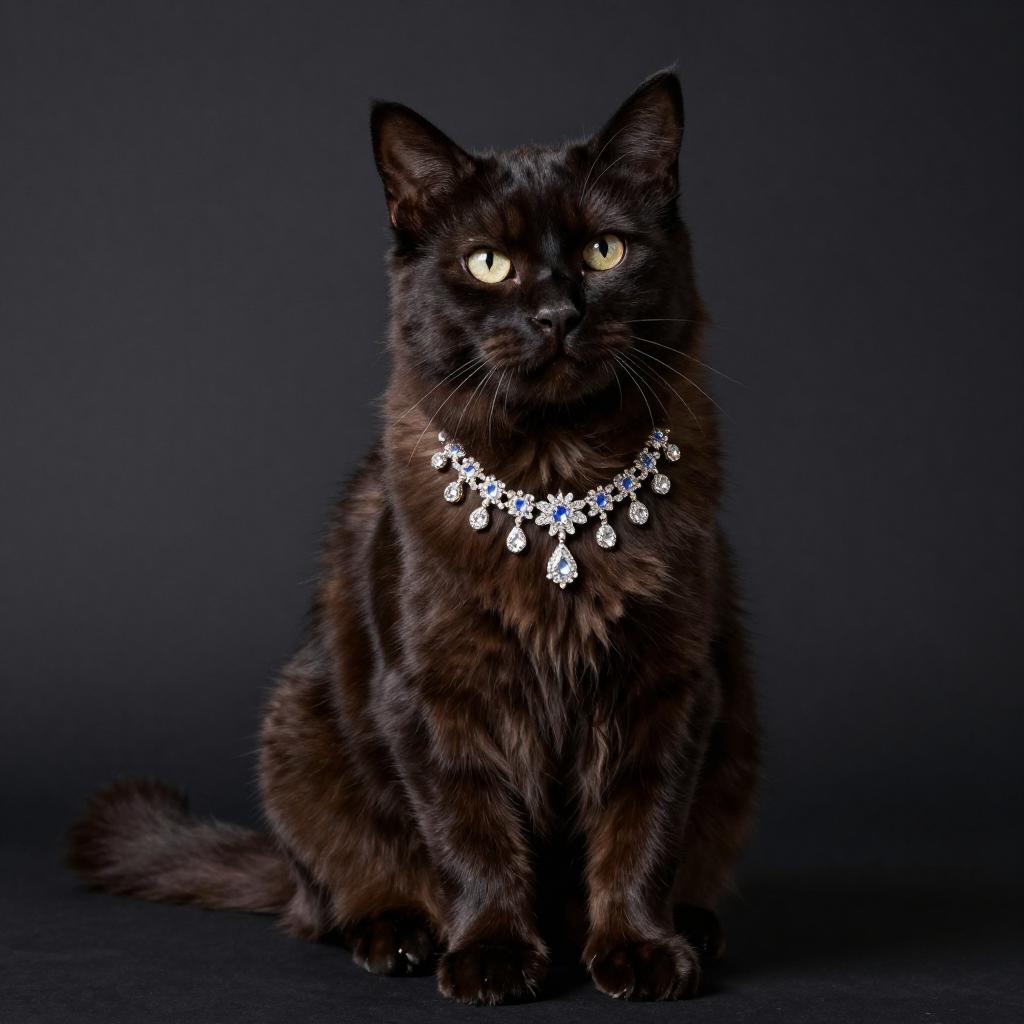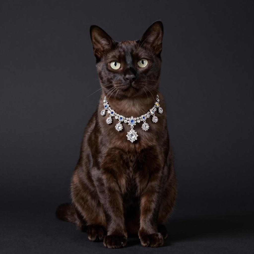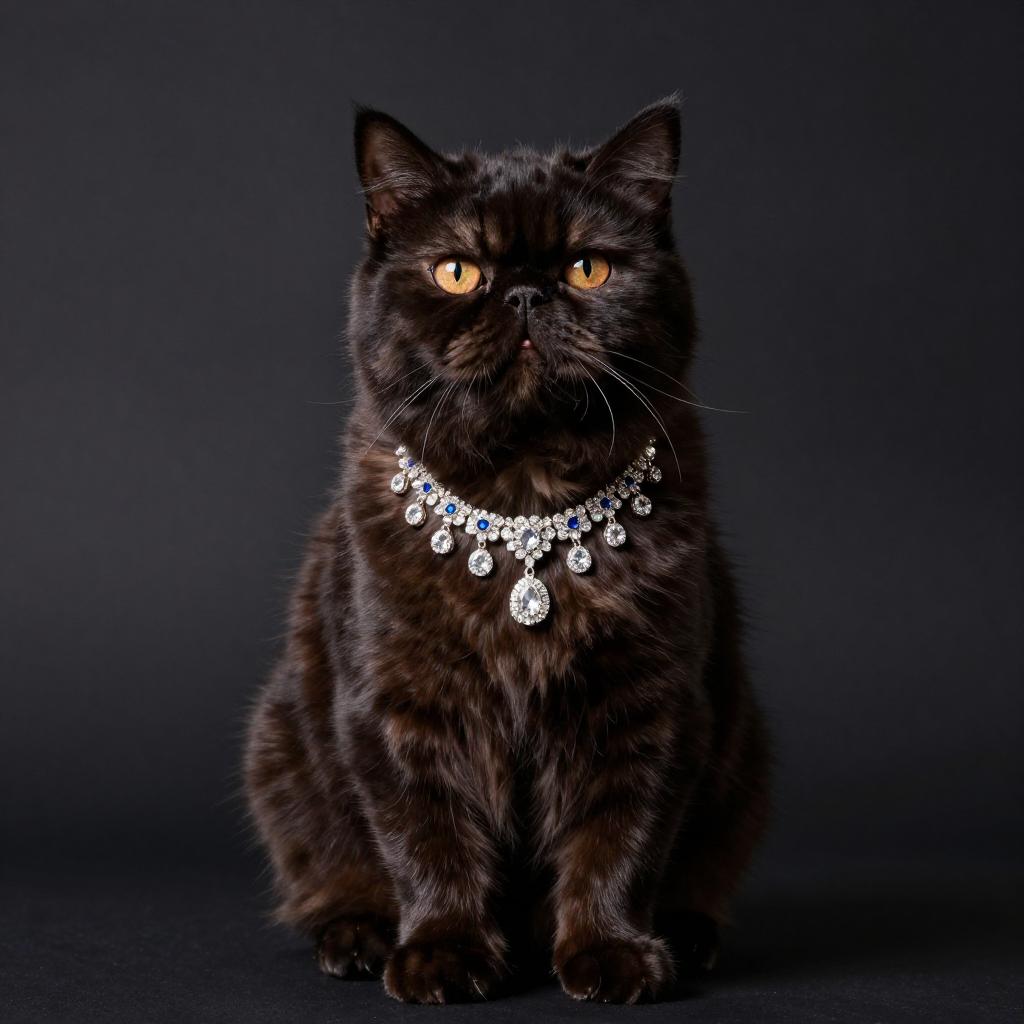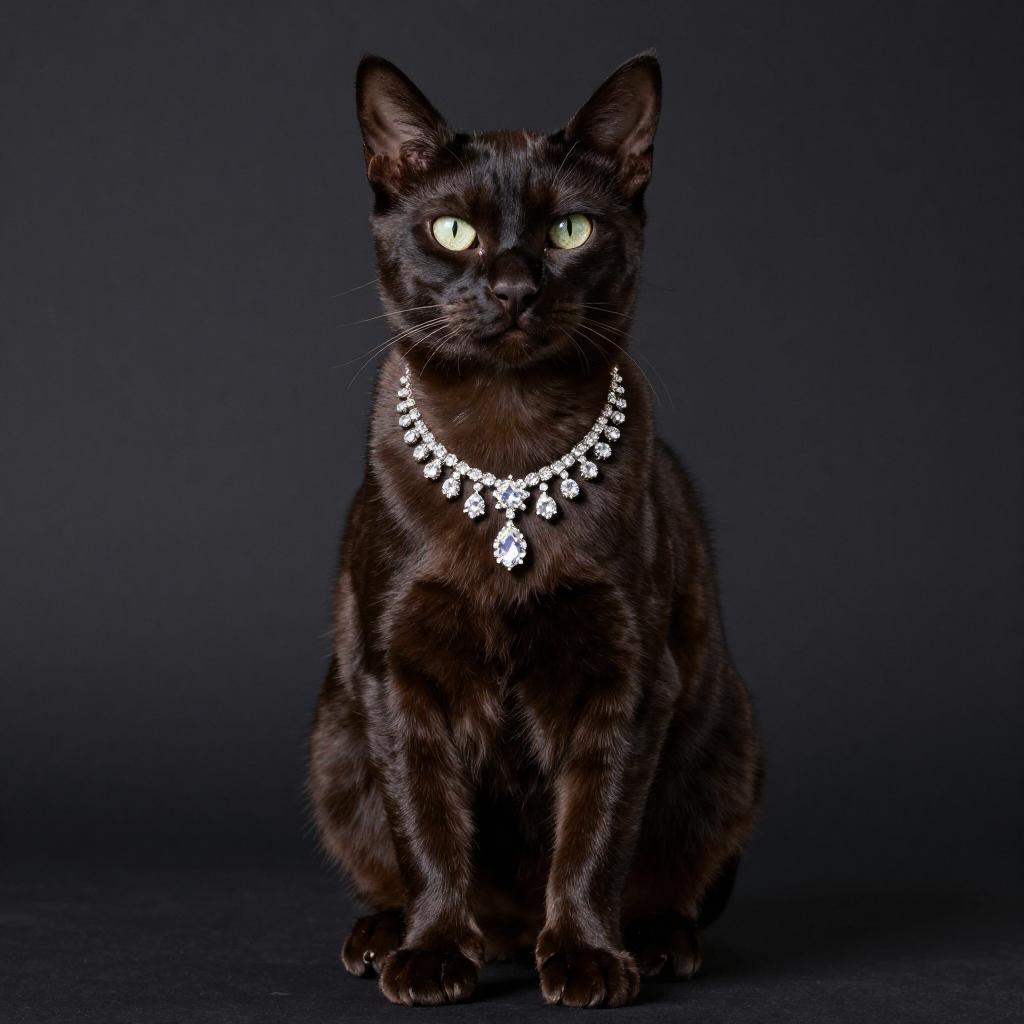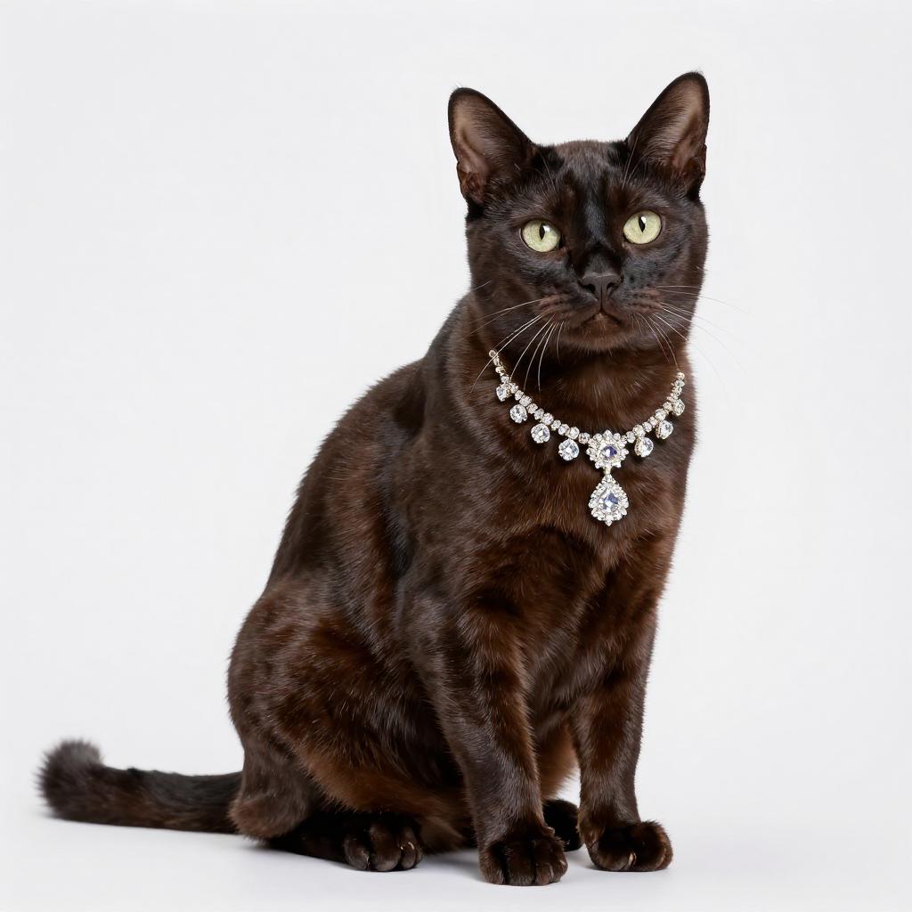 Luxurious studio portrait of a Oriental Shorthair cat sitting upright, glossy dark fur, wearing an ornate sparkling diamond necklace, clean dark background with spotlight, high-end fashion pet photography, high resolution, ultra-detailed